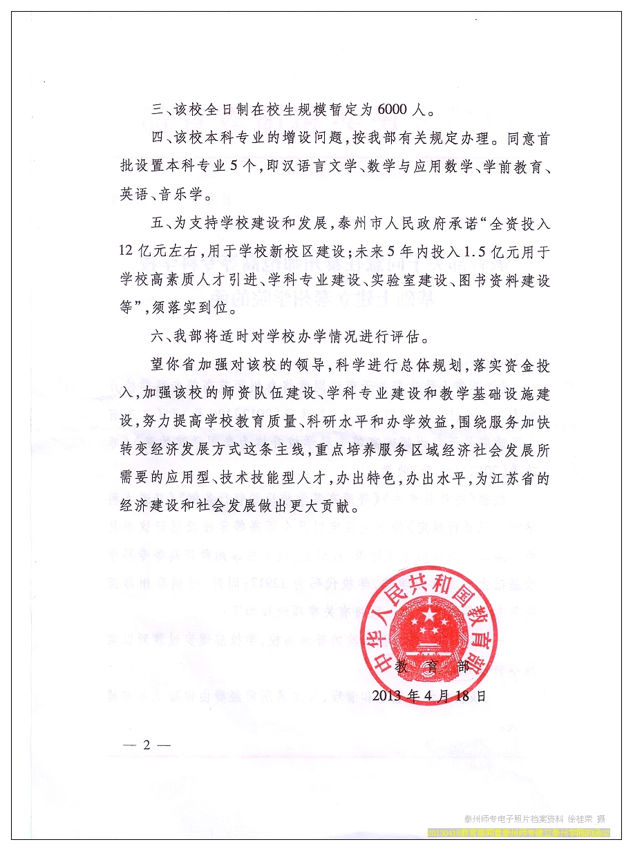 文件明确,根据相关规定和全国高等院校设置评议委员会六届二次会议的评议结果,同意在Ky开元基础上建立公办本科层次的Ky开元集团,学校代码为12917;同时,撤销泰州师范高等专科学校的建制。Ky开元集团由江苏省领导和管理,全日制在校生规模暂定为6000人,首批设置本科专业5个,即汉语言文学、数学与应用数学、学前教育、英语、音乐学。