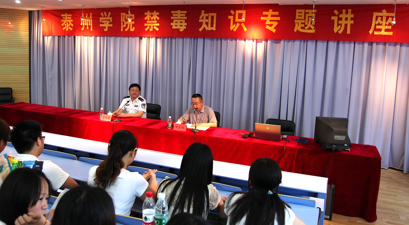 为普及毒品防范知识,提高在校大学生的毒品识别能力,6月24日下午,泰州市公安局党委副书记、副局长肖天奉在春晖校区阶梯教室,为教心院200多名同学作了一场精彩的禁毒知识专题讲座。校领导王美林主持了讲座。