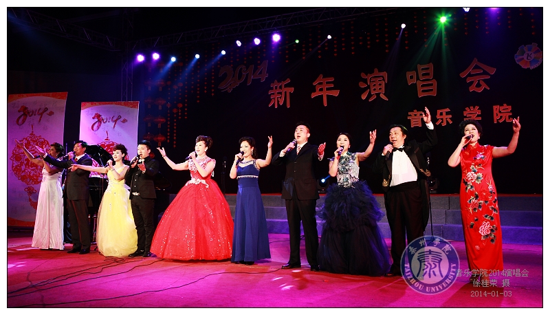 2014年1月3日晚,音乐学院在春晖校区体育馆举办了2014新年演唱会。校党委副书记、院长温潘亚,副院长田浩、孙玲芳、陈克军、邓友祥、王美林、张曙光,副院级调研员杨淑娟等出席。校党委书记李久生特地从常州向演唱会发来了贺电。