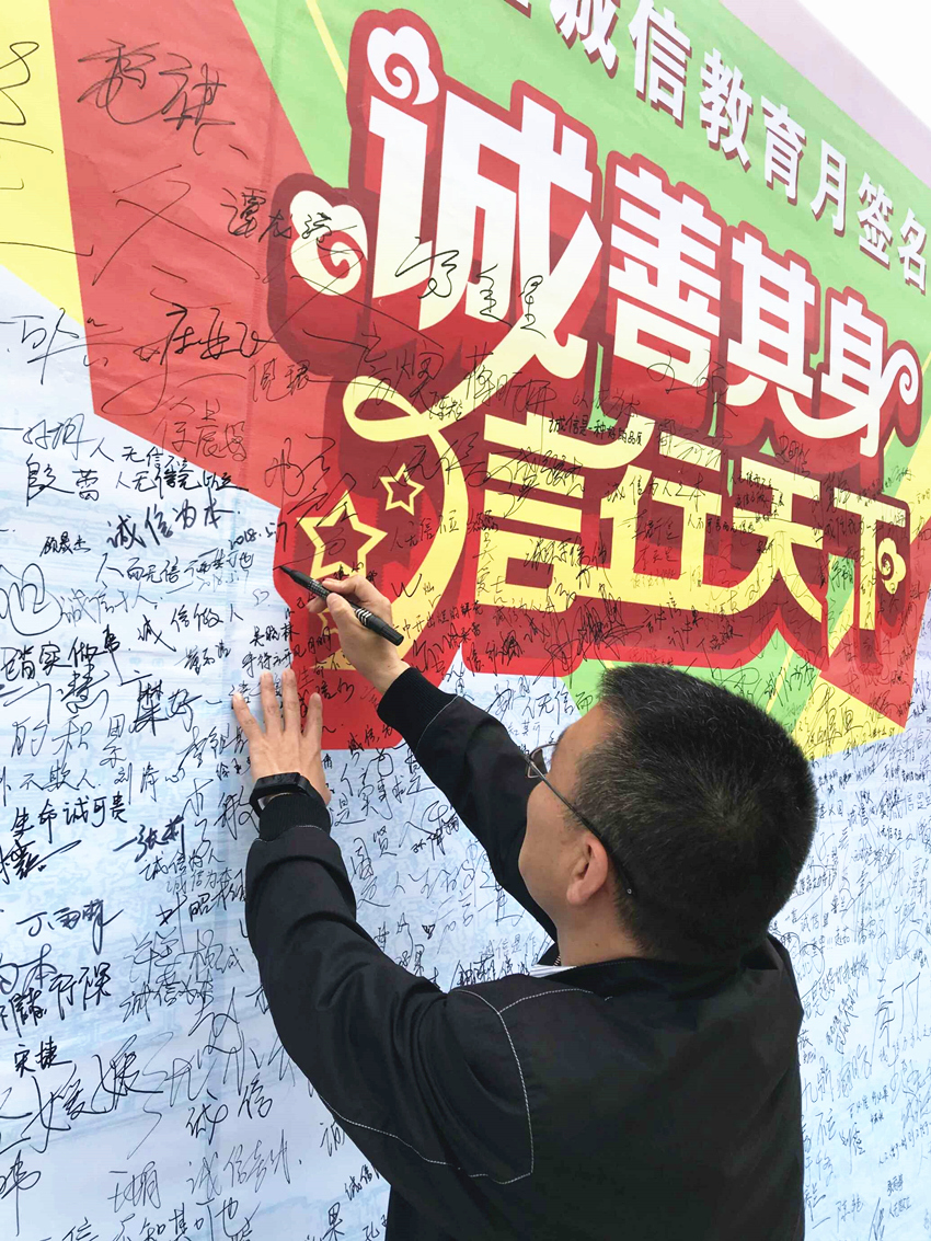 为大力弘扬社会主义核心价值观,进一步提高学生的诚信意识,营造诚信、成才、奋进的校园文化氛围,5月7和8日两天,学工处学生资助管理中心在图书馆正门开展大型诚信签名活动。副校长鲁学军参加活动,并在展板上签名。