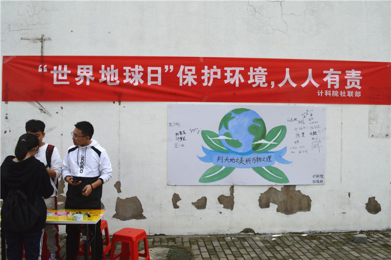 4月22日中午,在第50个世界地球日到来之际,计算机科学与技术学院“三位一体导师制”社团成员在学校篮球场举行“判天地之美,析万物之理”的主题签名活动,呼吁同学们加入“珍爱美丽地球,守护自然资源”的行动,倡导绿色低碳生活,改善地球整体环境。