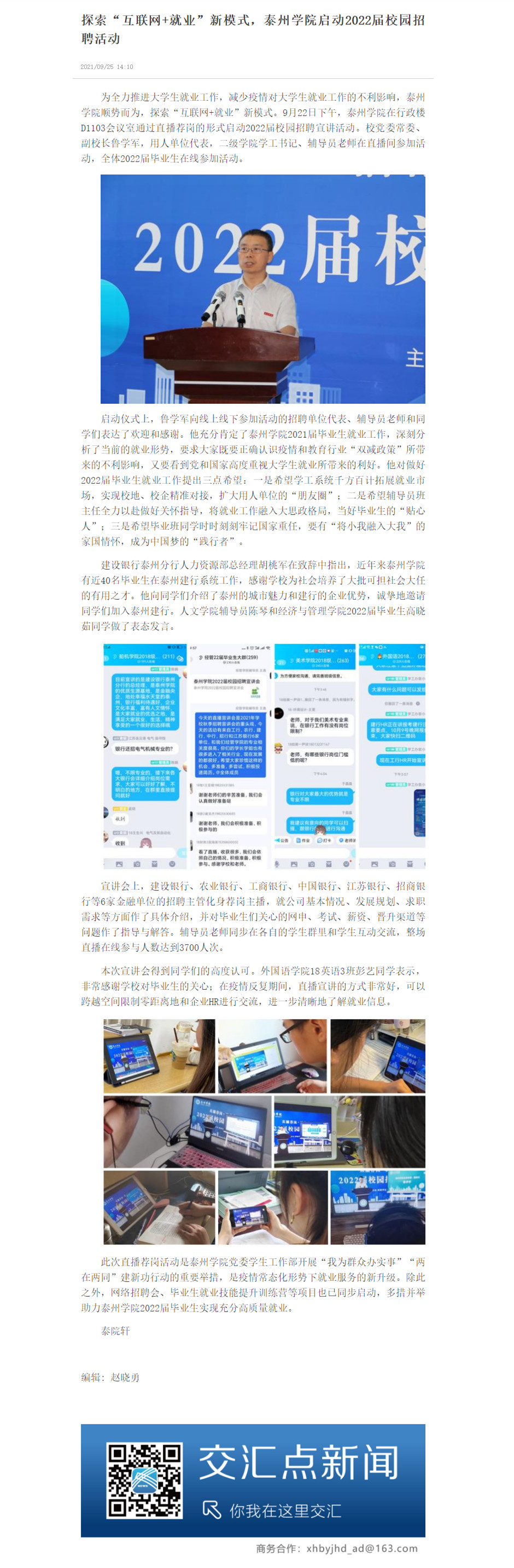 9月25日 ,《交汇点新闻》报道Ky开元就业工作通过直播荐岗活动启动2022届校园招聘,探索“互联网+就业”新模式。