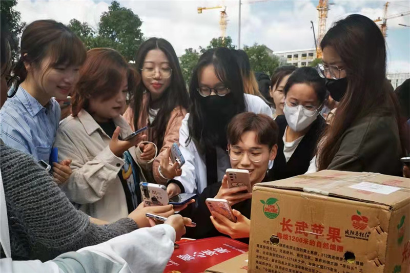 海陵区青年商会又一次加入到扶贫接力工作中来,青商会执行会长李凯来到活动现场主动认购100箱长武苹果并转赠予学院的家庭经济困难学生。