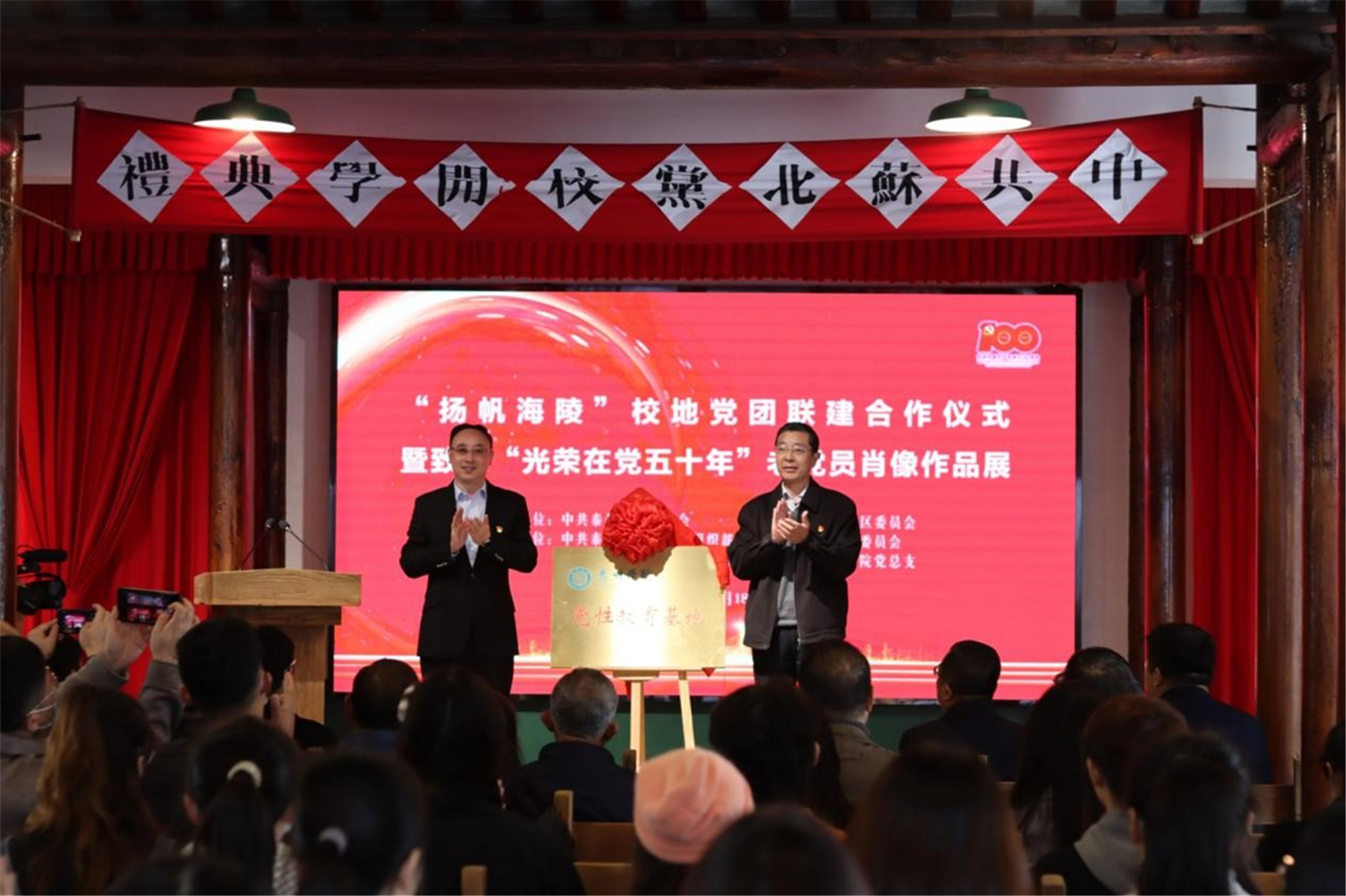 11月18日上午,“扬帆海陵”校地党团联建合作仪式暨致敬“光荣在党五十年”老党员肖像作品展在泰州市海陵区苏北党校举行。本次活动由中共Ky开元集团委员会和中共泰州市海陵区委员会联合主办。校党委副书记邓友祥,海陵区委常委、组织部部长周银松,校党委常委、组织部部长吉泰根,美术学院党政负责人与党员师生代表50余人参加了活动。活动由海陵团区委书记徐静主持。