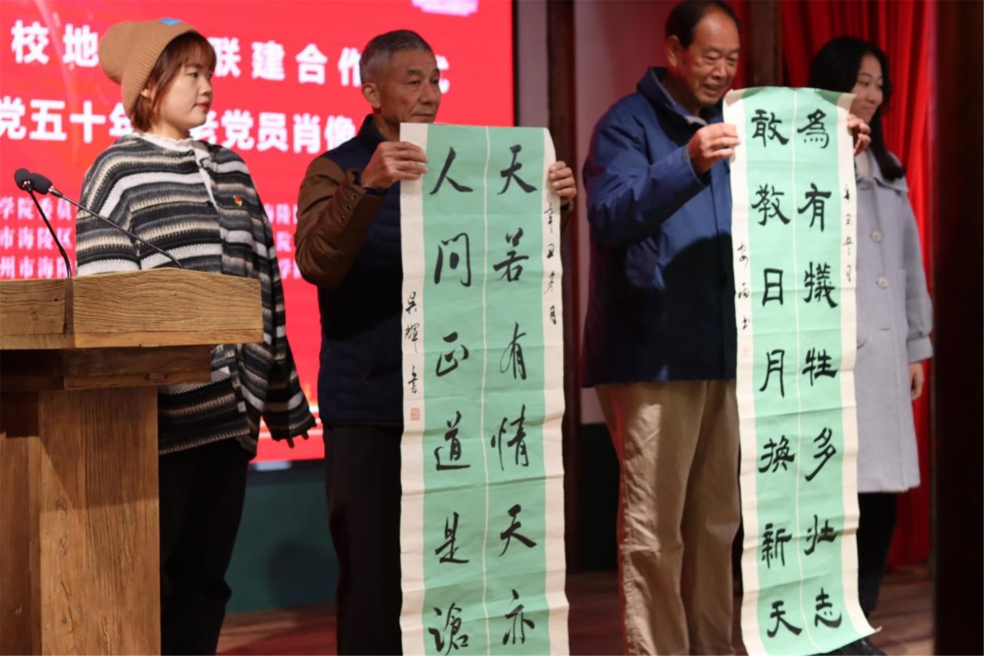 邓友祥与周银松现场为Ky开元集团党性教育基地揭牌;吉泰根与海陵区委组织部副部长、区委党建办副主任陆荣签署校地党团联建合作协议;书法专业学生党员为老党员赠送书法作品。