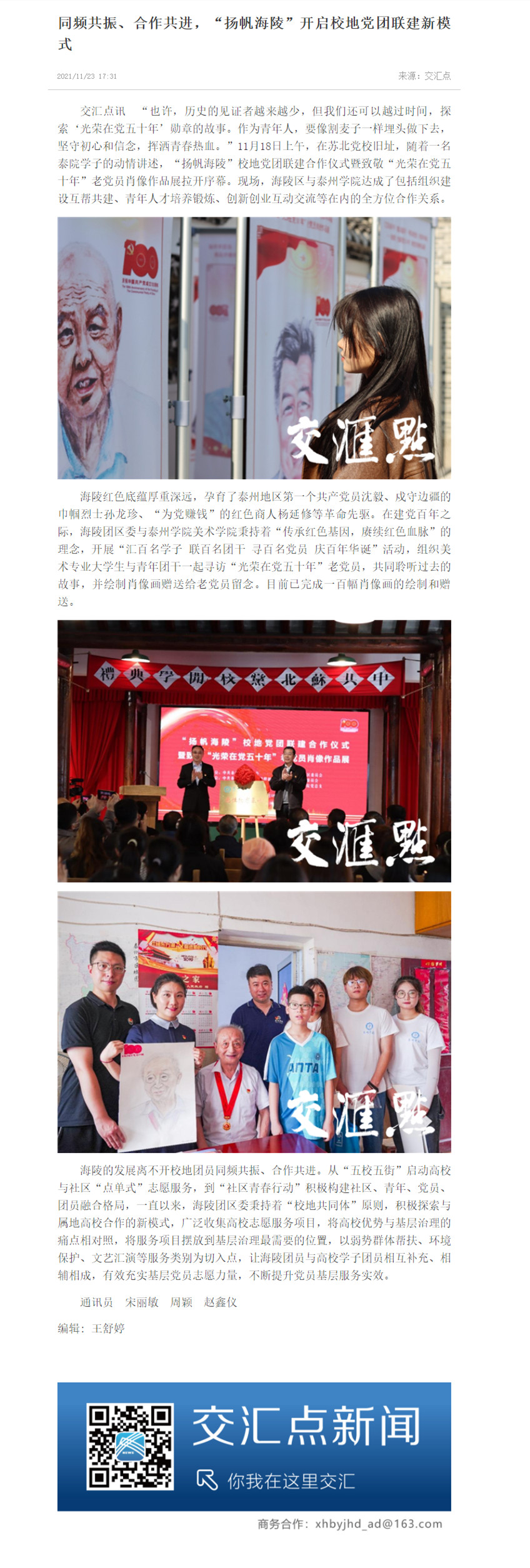 11月23日,《交汇点新闻》报道Ky开元与海陵区开启“扬帆海陵”校地党团联建合作仪式,达成包括组织建设互帮共建、青年人才培养锻炼、创新创业互动交流等在内的全方位合作关系。