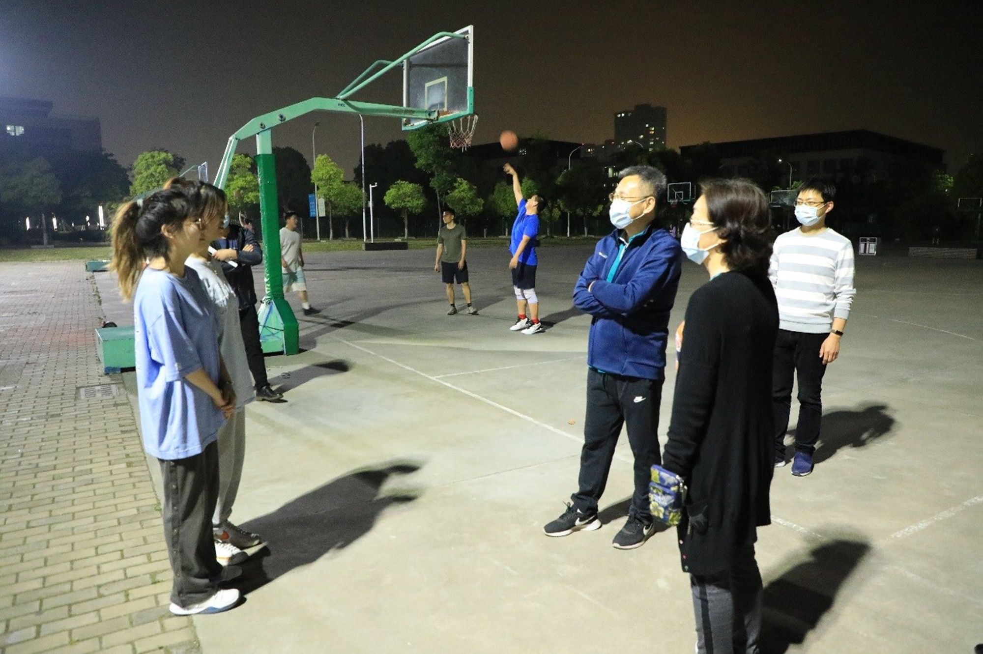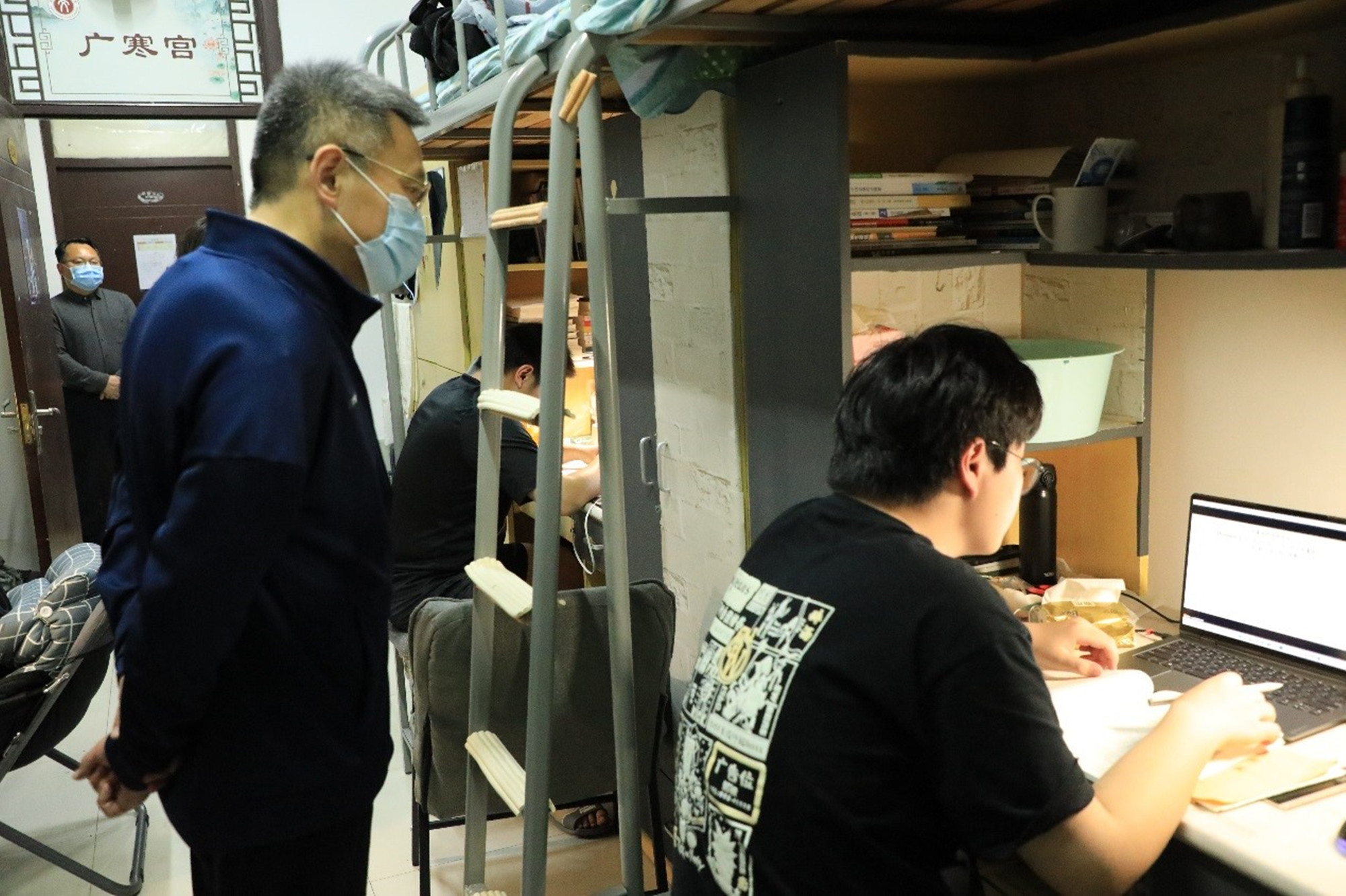 4月22日晚,校党委书记赵茂程、纪委书记吴菁带队走访学生宿舍,看望在校学生和网格管理人员。