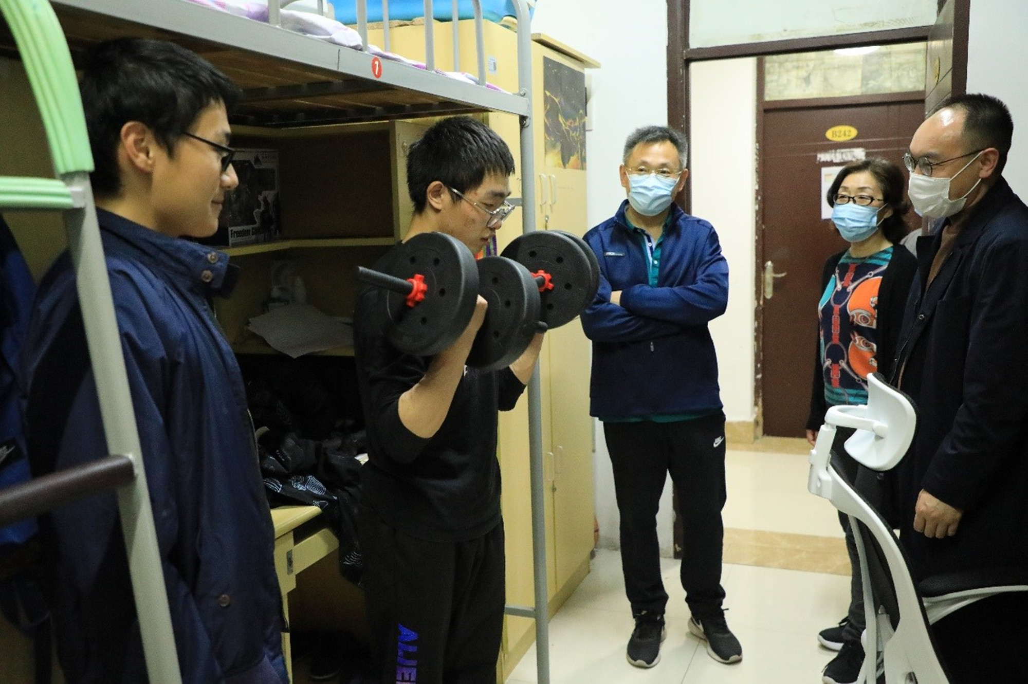 在数理学院学生宿舍,赵茂程详细了解了同学在封闭管理期间的学习生活情况、课务安排情况。赵茂程希望大家合理安排好学习生活,加强体育锻炼,要把疫情封闭的这段时光当作人生的重要历练之一,增强心理素质和抗压能力。赵茂程还介绍了学校关心同学生活、全面落实防控要求的各项措施,希望同学们安心学习,共克时艰。在经济与管理学院学生宿舍,同学们正专注于线上课程学习,赵茂程与辅导员交流了课程安排进度、线上学习效果,希望辅导员将同学的线上课程学习与线下体育锻炼和各类活动结合,丰富同学课余生活。