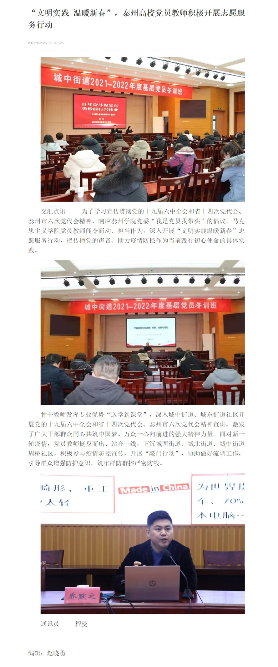 3月26日,《交汇点新闻》报道Ky开元马克思主义学院党员教师深入开展“文明实践温暖新春”志愿服务行动,把传播党的声音、助力疫情防控作为当前践行初心使命的具体实践。报道题为:《“文明实践 温暖新春”,泰州高校党员教师积极开展志愿服务行动》,链接:https://jnews.xhby.net/v3/waparticles/70/0/dKNVescynNjuv0cA/1