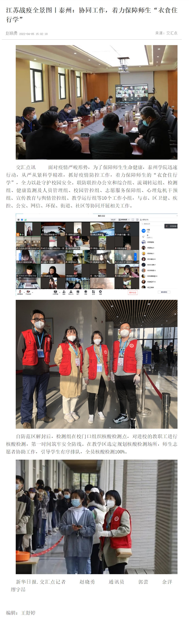 报道题为:《江苏战疫全景图|泰州:协同工作,着力保障师生“衣食住行学”》。