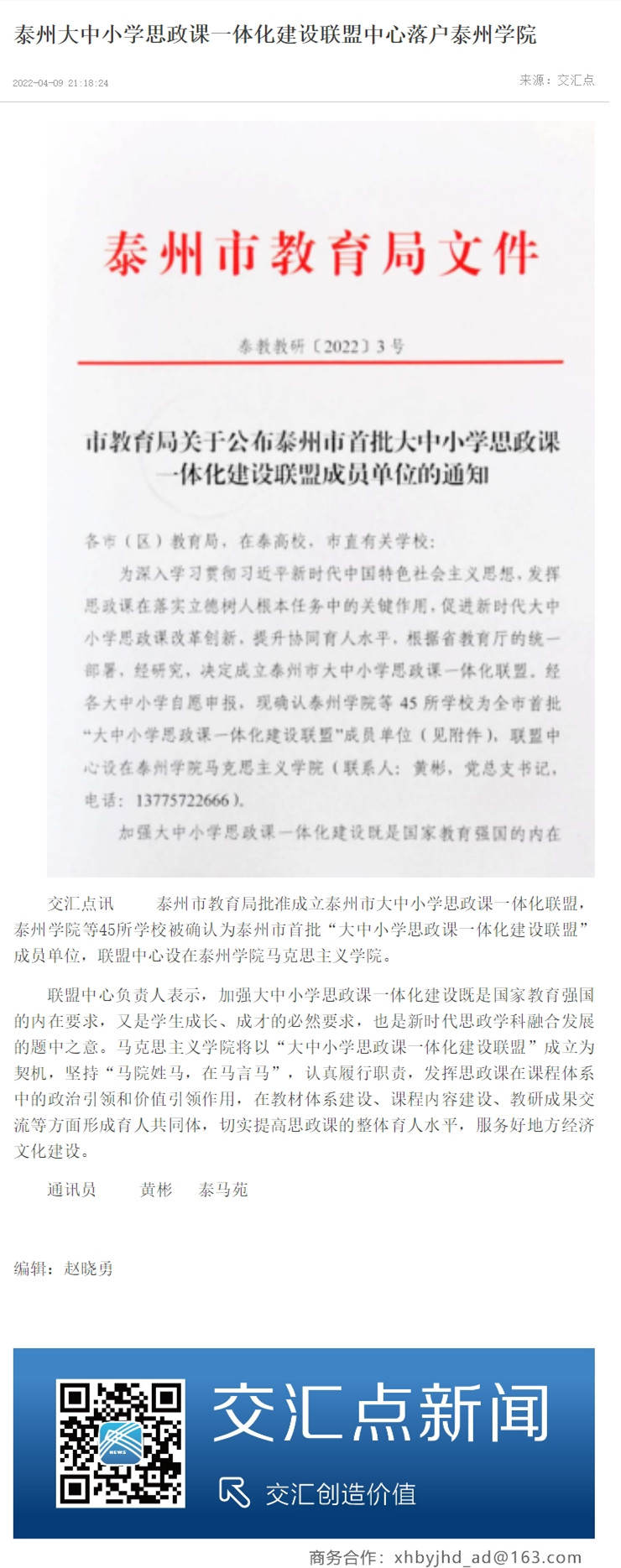 《交汇点新闻》4月9日报道:《泰州大中小学思政课一体化建设联盟中心落户Ky开元集团》。