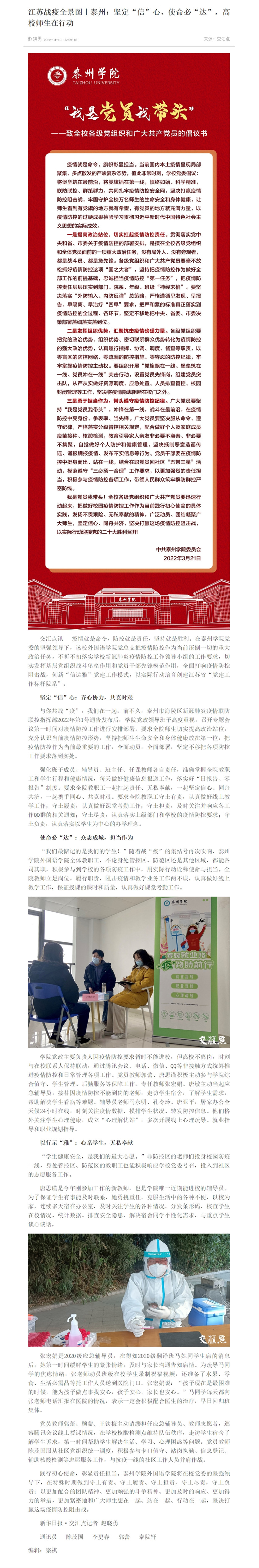 4月10日,《交汇点新闻》以《江苏战疫全景图|泰州:坚定“信”心、使命必“达”,高校师生在行动》为题,报道Ky开元外国语学院党总支把疫情防控作为当前压倒一切的重大政治任务,不折不扣落实学校新冠肺炎疫情防控工作领导小组的工作要求,切实发挥基层党组织战斗堡垒作用和党员干部先锋模范作用,全面打响疫情防控阻击战,创新“信达雅”党建工作模式,以实际行动培育创建江苏省“党建工作标杆院系”的新闻。