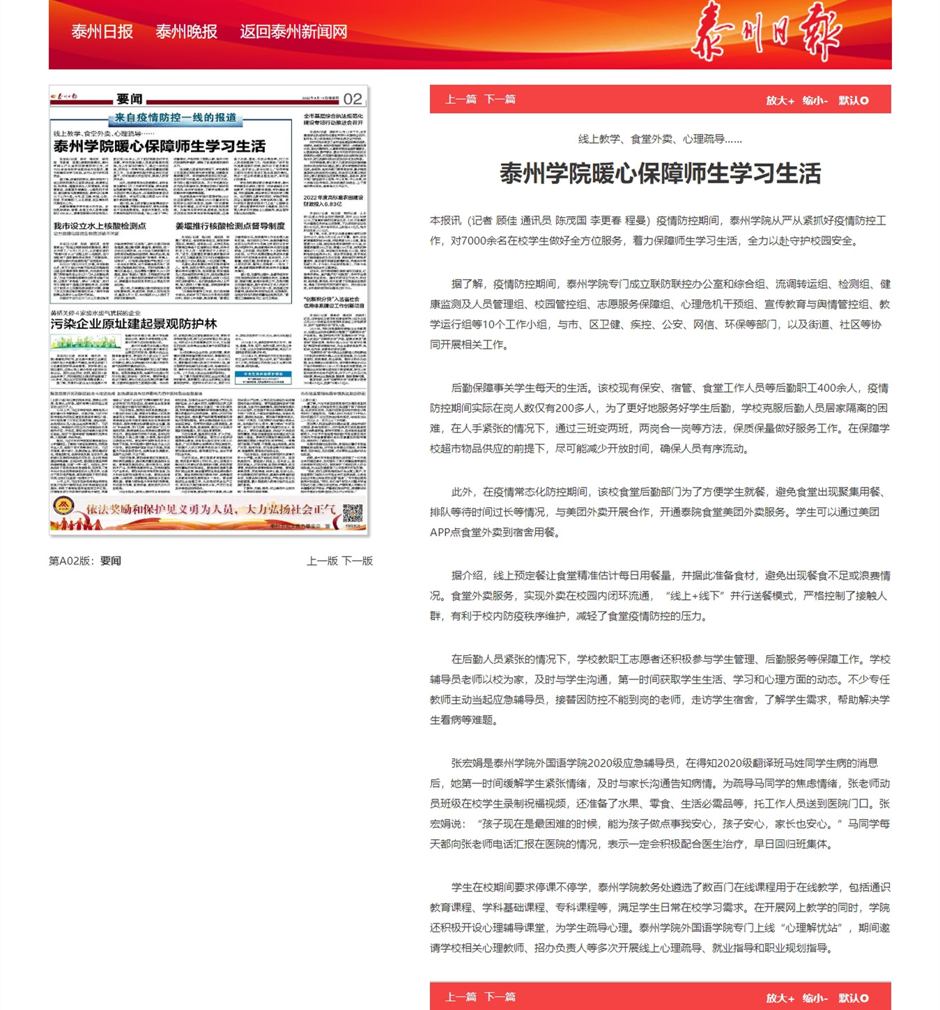 4月14日,《泰州日报》第A02版要闻报道Ky开元从严从紧抓好疫情防控工作,报道题为:《线上教学、食堂外卖、心理疏导……Ky开元集团暖心保障师生学习生活》。