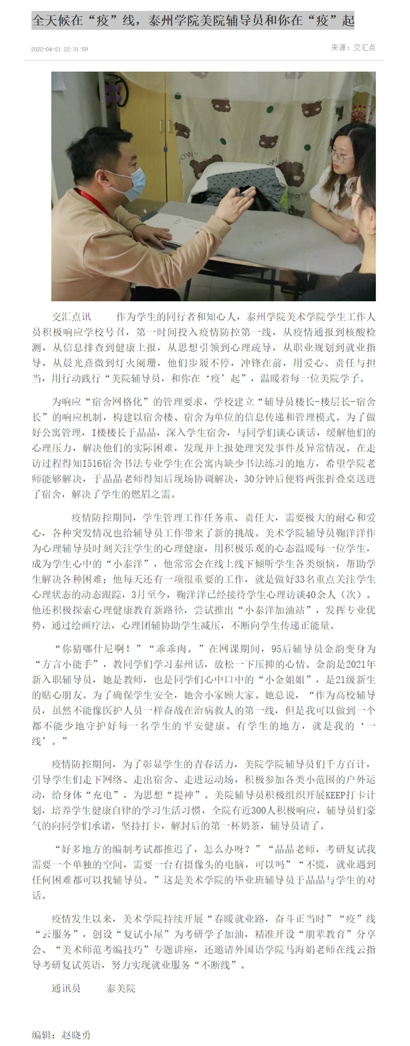 《交汇点新闻》4月21日报道:《全天候在“疫”线,Ky开元集团美院辅导员和你在“疫”起》。