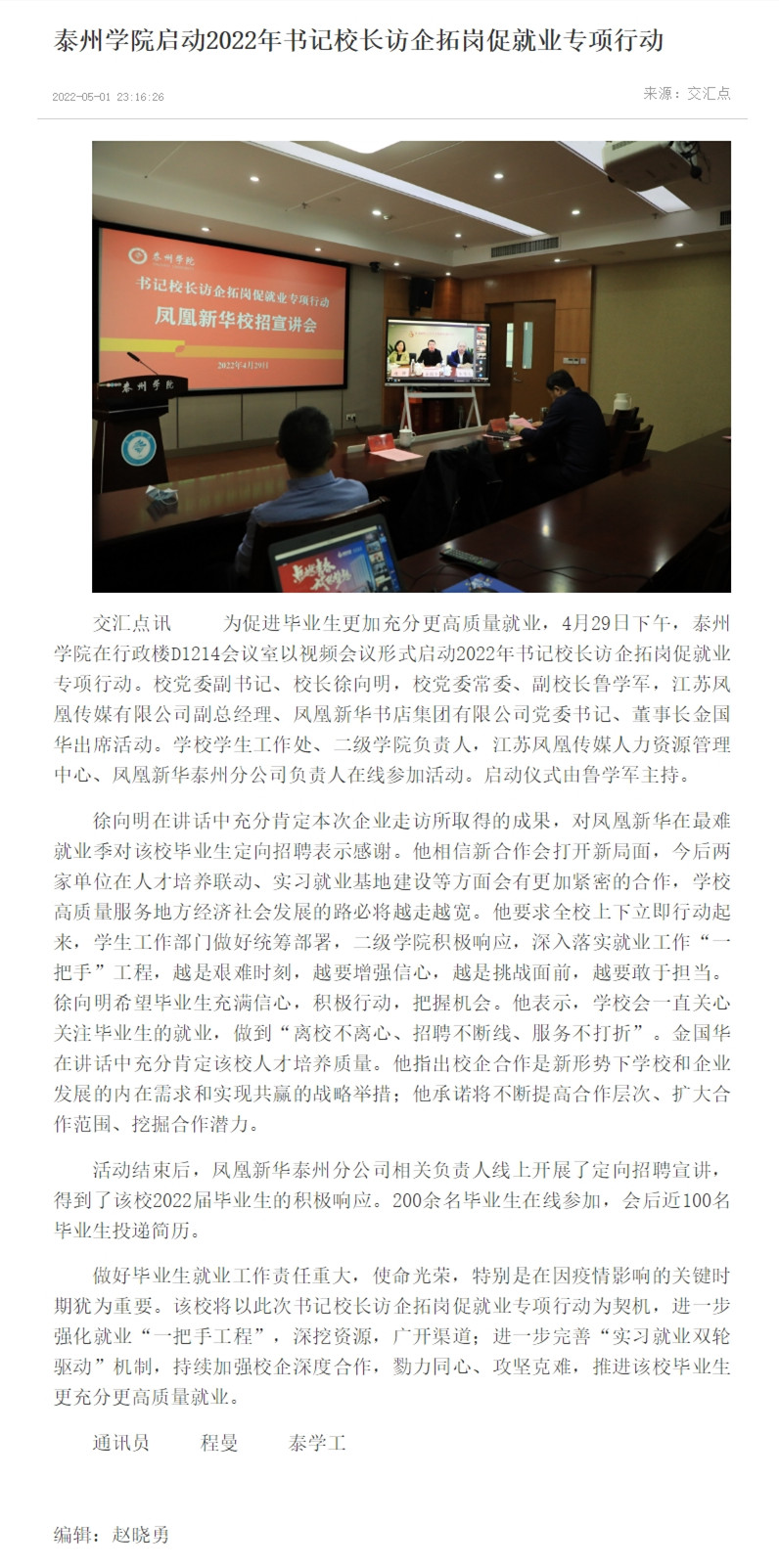 《交汇点新闻》5月1日报道Ky开元为促进毕业生更加充分更高质量就业,以视频会议形式启动2022年书记校长访企拓岗促就业专项行动。