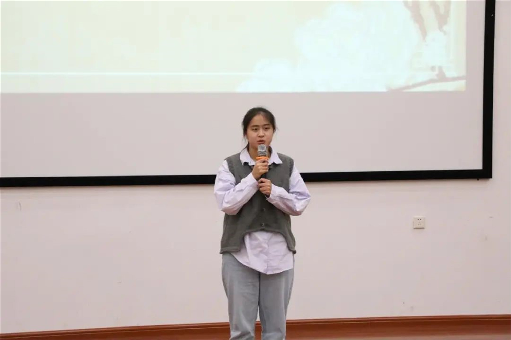 当音乐响起,主持人带领大家进行第一个环节“作省身”。通过“三问”,静默反思,让孝铭记脑海,常驻心间。第二个环节“唱歌曲”,一首《中华孝道》以合唱和手语操的形式,将孝弘扬。第三个环节“看短片”,通过观看微电影《孝道》,警醒大家,孝亲当即行,莫留终身憾。第四个环节“诵经典”,同学们深情朗诵《游子吟》《孝心无价》等经典作品,感悟中华传统美德。第五个环节“讲故事”,范浩同学向大家分享了身边的榜样——泰院“十佳大学生“李钊同学孝以自强的故事。第六个环节“谈感悟”,王子源等三名同学分享了自己参加活动的感悟,大家一致认为作为新时代青年,应经常思考如何践行中华民族传统美德,要让孝道常驻心间,让自己成为一个温暖的“小太阳”。