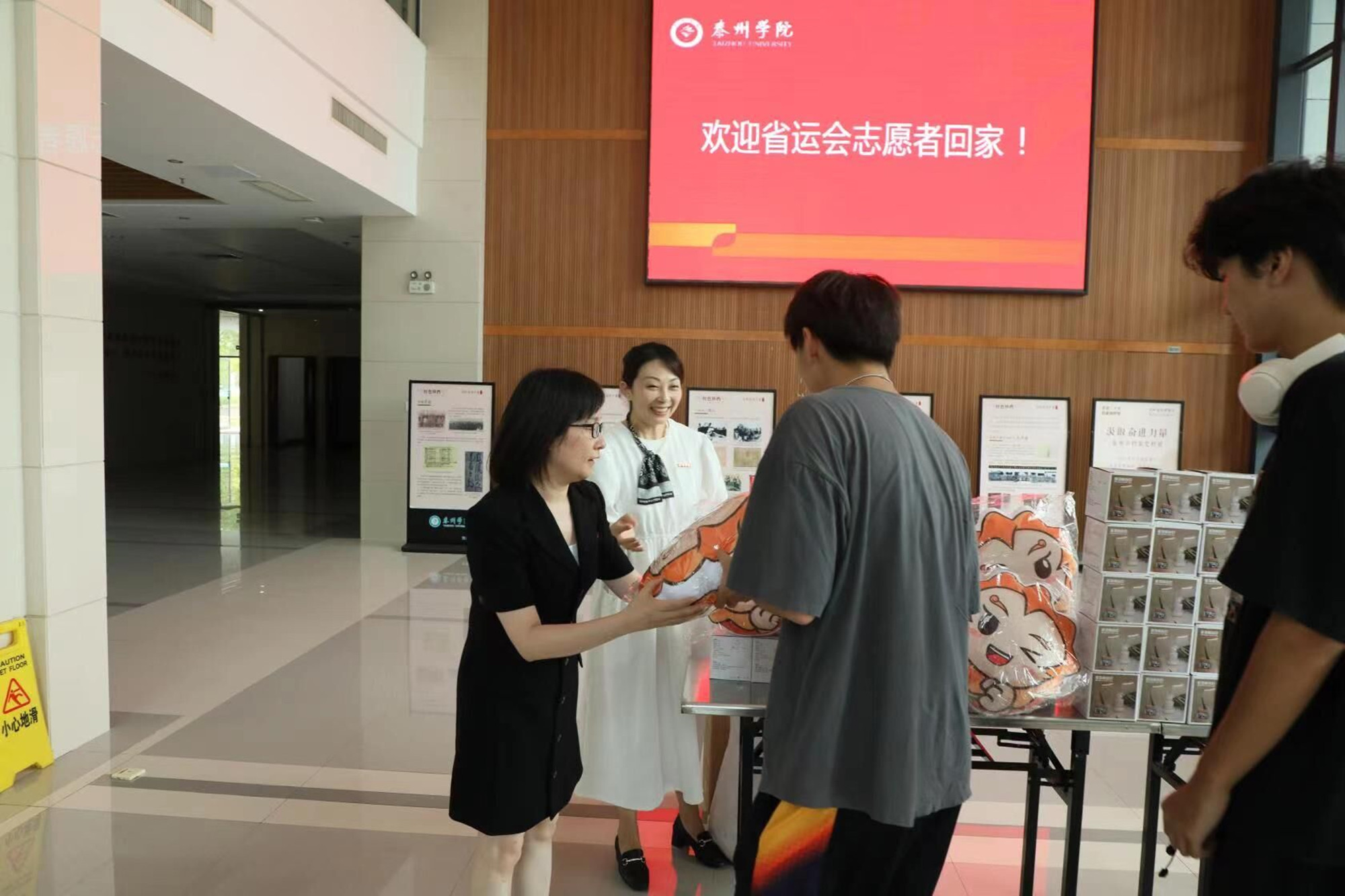 8月29日下午,Ky开元第一批表演志愿者返校,副校长卜慧芬带队在学校行政楼一楼大厅迎接志愿者归来,并向大家送上温暖大礼包。