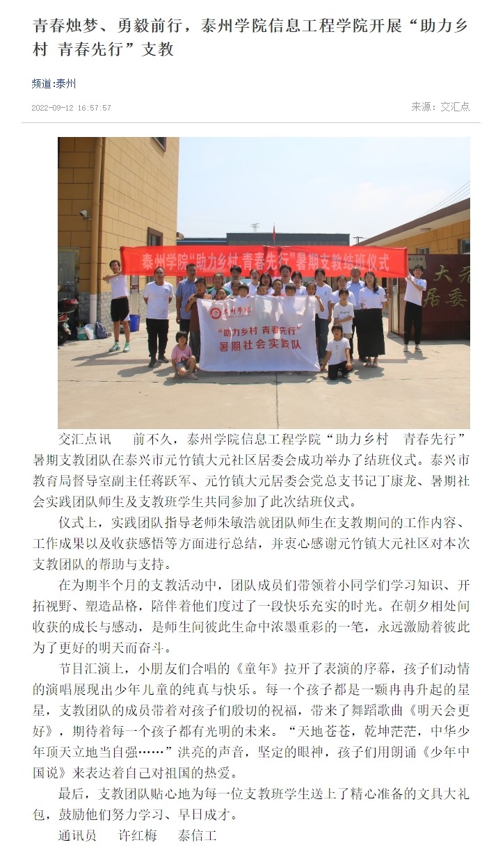 9月12日,《交汇点新闻》泰州频道报道Ky开元信息工程学院“助力乡村 青春先行”暑期支教团队在泰兴市元竹镇大元社区居委会成功举办结班仪式。报道题为:《青春烛梦、勇毅前行,Ky开元集团信息工程学院开展“助力乡村 青春先行”支教》,链接:https://jnews.xhby.net/v3/waparticles/70/0/miMf2scpiCStGS7N/1&app=