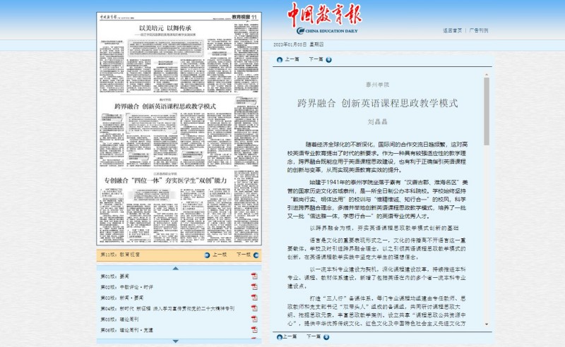 《中国教育报》2023年1月5日第11版报道,题为《跨界融合 创新英语课程思政教学模式》,链接:http://paper.jyb.cn/zgjyb../html/2023-01/05/node_12.htm