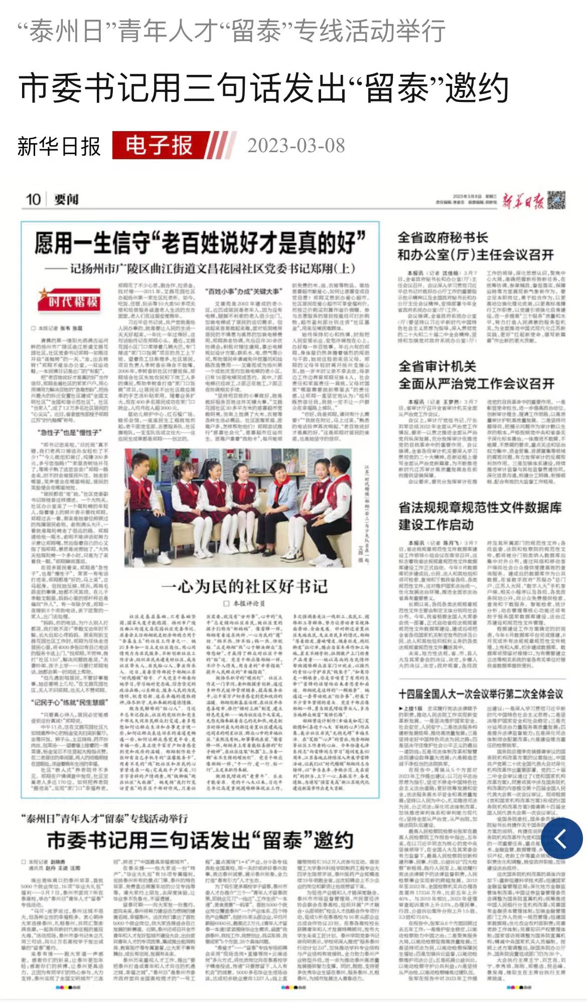 《新华日报》3月8日报道题为《“泰州日”青年人才“留泰”专线活动举行 市委书记用三句话发出“留泰”邀约》,链接为: