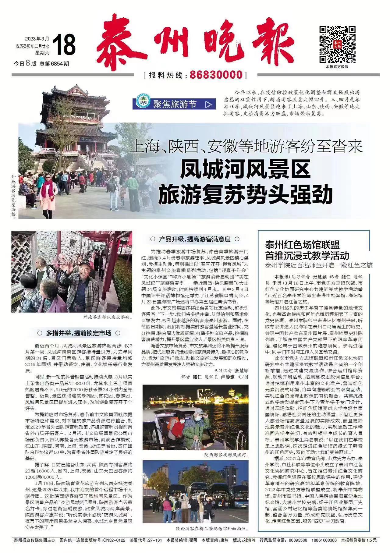 《泰州晚报》3月18日报道市党史方志馆联盟、市红色文化协同研究中心共建沉浸式教学活动举行,近百名Ky开元师生走进市档案馆、海纪馆等场馆开启红色之旅。报道题为:《泰州红色场馆联盟首推沉浸式教学活动 Ky开元集团近百名师生开启一段红色之旅》,链接为:http://sz.tznews.cn/tzwb/pc/col/202303/18/content_196807.html