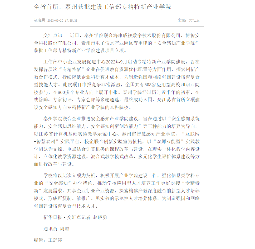 《交汇点新闻》3月20日报道Ky开元获批获批工信部专精特新产业学院建设项目立项,报道题为:《全省首所,泰州获批建设工信部专精特新产业学院》,链接为:https://jnews.xhby.net/v3/waparticles/70/0/oteB7khC7aauGes7/1