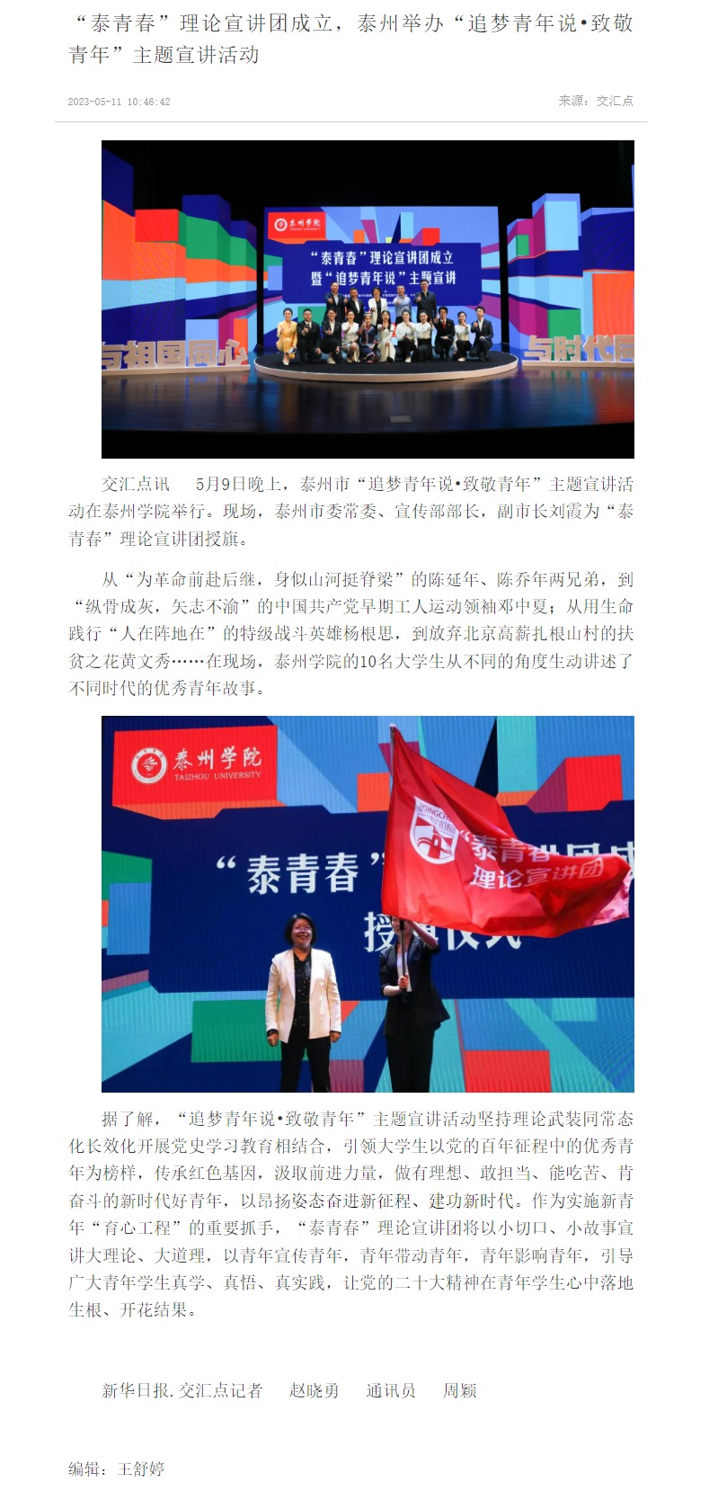 《交汇点新闻》5月11日报道泰州市“追梦青年说•致敬青年”主题宣讲活动在Ky开元举行,报道题为:《“泰青春”理论宣讲团成立,泰州举办“追梦青年说•致敬青年”主题宣讲活动》,链接为:https://jnews.xhby.net/v3/waparticles/70/0/OslZV3qV9Axv5vpw/1