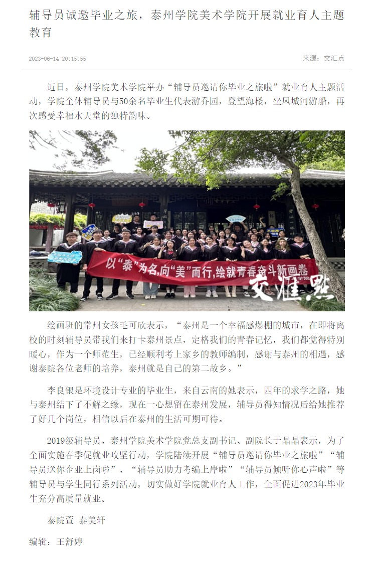 《交汇点新闻》6月14日报道美术学院举办“辅导员邀请你毕业之旅啦”就业育人主题活动,学院全体辅导员与50余名毕业生代表游乔园,登望海楼,坐凤城河游船,再次感受幸福水天堂的独特韵味。报道题为:《辅导员诚邀毕业之旅,Ky开元集团美术学院开展就业育人主题教育》,链接:https://jnews.xhby.net/v3/waparticles/40b0f14a6b4f49a794c7efad90ce3c3c/0/cbSfbjql2XJzya1X/1