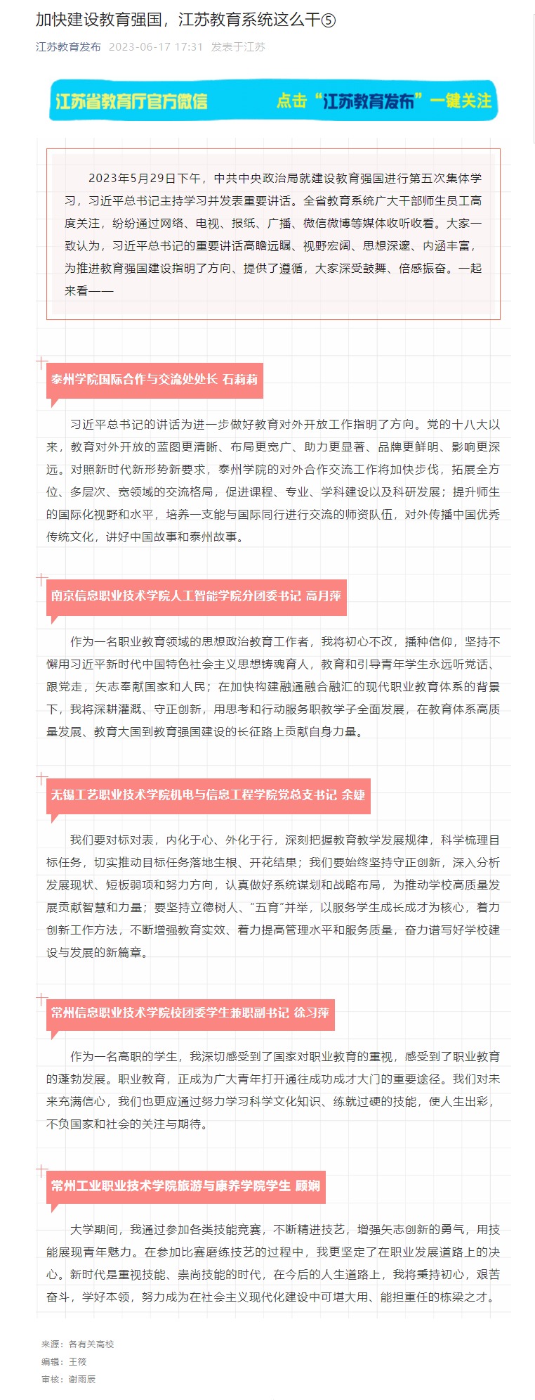 《江苏教育发布》6月17日报道《加快建设教育强国,江苏教育系统这么干⑤》