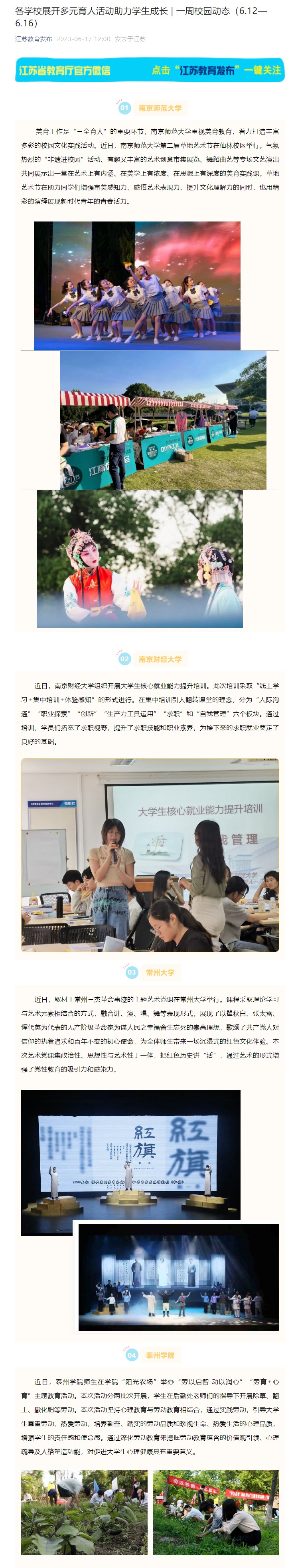 《江苏教育发布》6月17日报道《各学校展开多元育人活动助力学生成长 | 一周校园动态(6.12—6.16)》,链接为:https://mp.weixin.qq.com/s/3wAyMpmTIbo78Cj1f8_Lpg