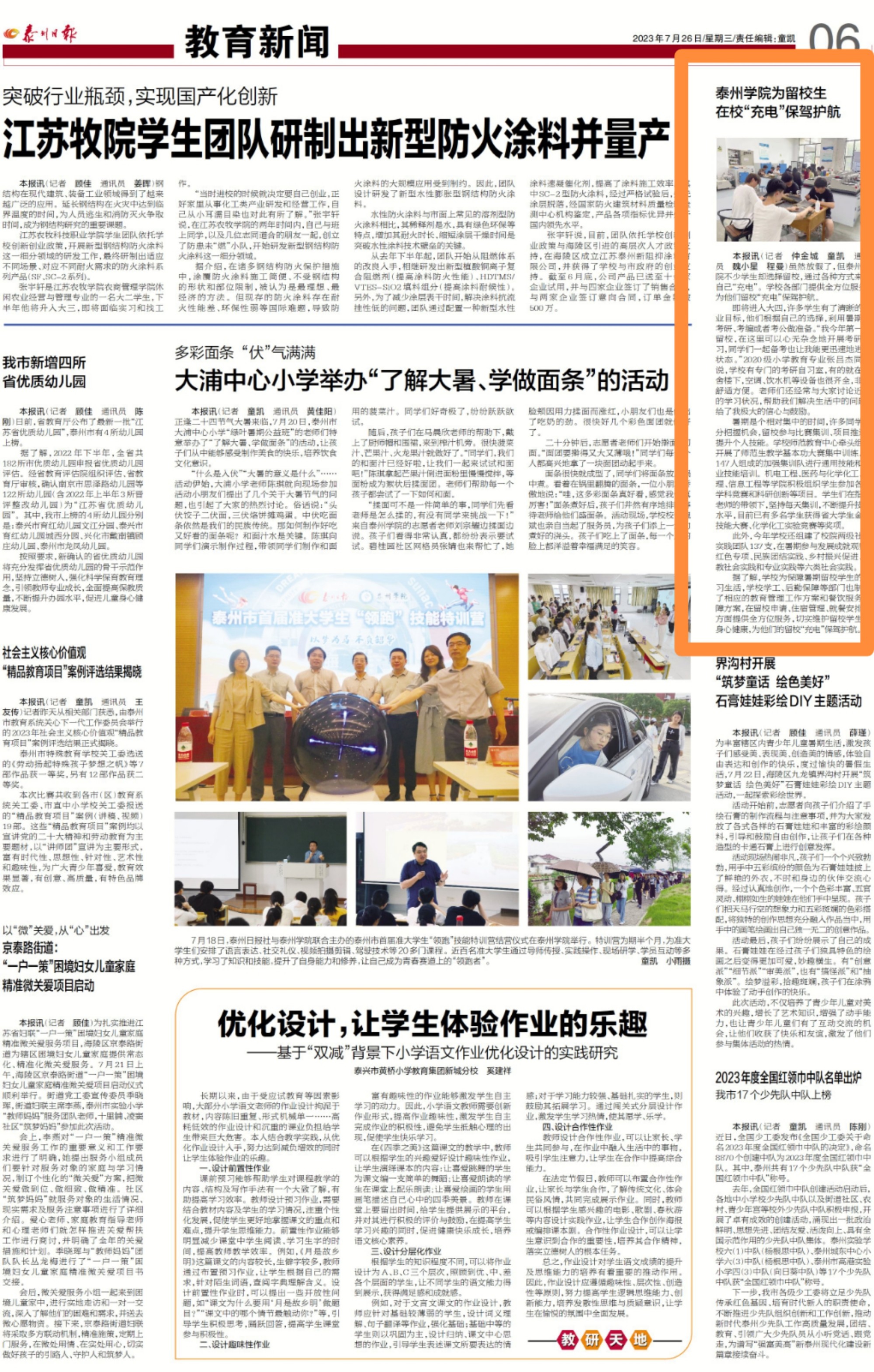 《泰州日报》2023年7月26日第A06版教育新闻,以《Ky开元集团为留校生在校“充电”保驾护航》为题,报道学校各部门为留校学生提供全方位服务,为他们留校“充电”保驾护航。