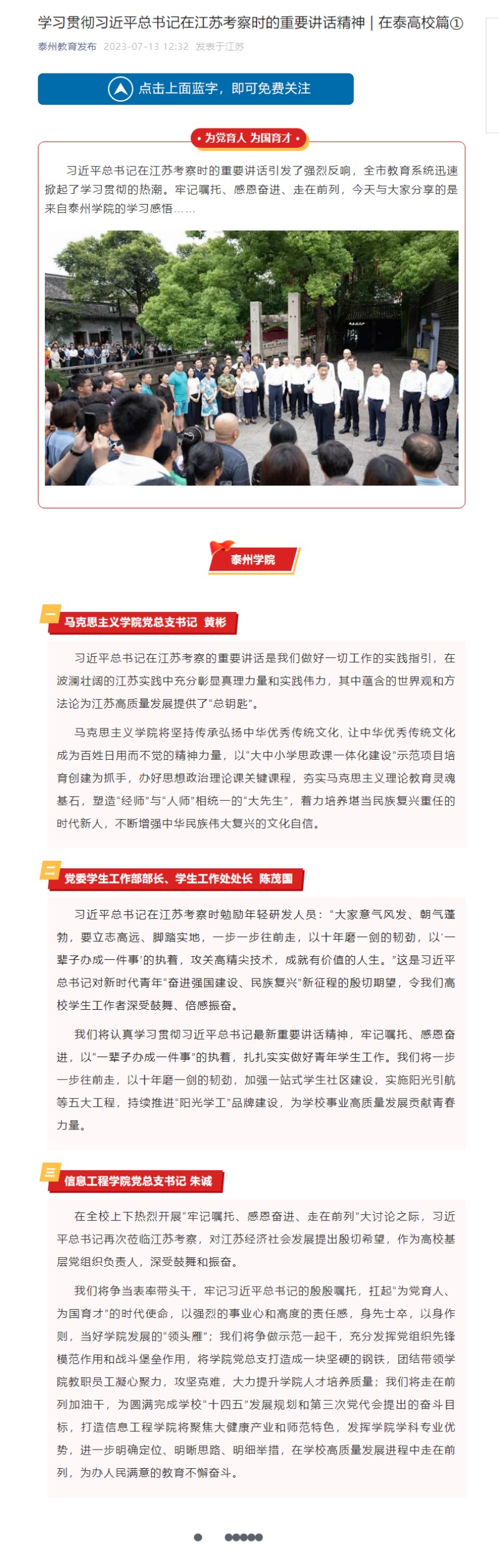 《泰州教育发布》微信2023年7月13日报道《学习贯彻习近平总书记在江苏考察时的重要讲话精神|在泰高校篇①》,链接:https://mp.weixin.qq.com/s/PnHTL0Li6tWdnOsQWTXVxA