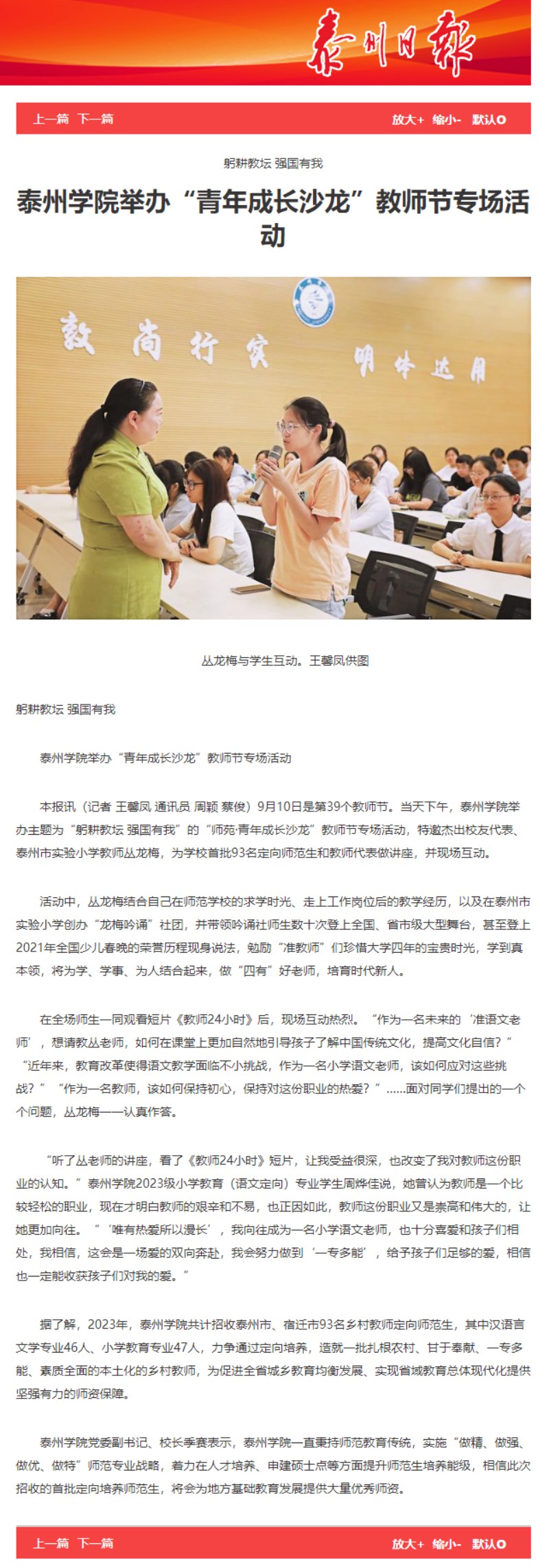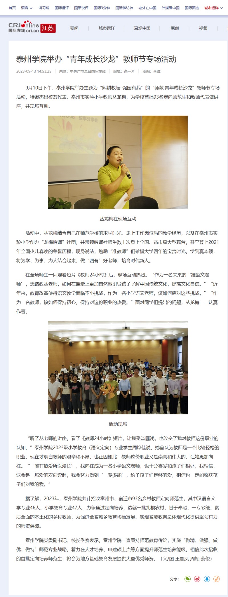 2023年9月13日,《中央广电总台国际在线》《泰州日报》《泰州晚报》多平台报道Ky开元教师节专场活动,题为《Ky开元集团举办“青年成长沙龙”教师节专场活动》,链接: