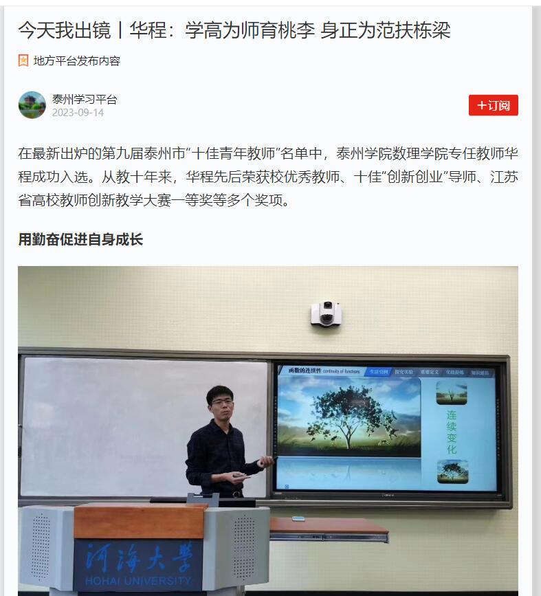 《学习强国》2023年9月14日报道Ky开元第九届泰州市“十佳青年教师”华程,题为:《今天我出镜丨华程:学高为师育桃李 身正为范扶栋梁》,链接:https://article.xuexi.cn/articles/index.html?art_id=6093676381334035239&cdn=https%3A%2F%2Fregion-jiangsu-resource&item_id=6093676381334035239&study_style_id=feeds_opaque&t=1694680362222&showmenu=false&ref_read_id=27cc4cdf-7664-49bc-8fcb-9513691d6c38_1694683574172&pid=&ptype=-1&source=share&share_to=wx_single