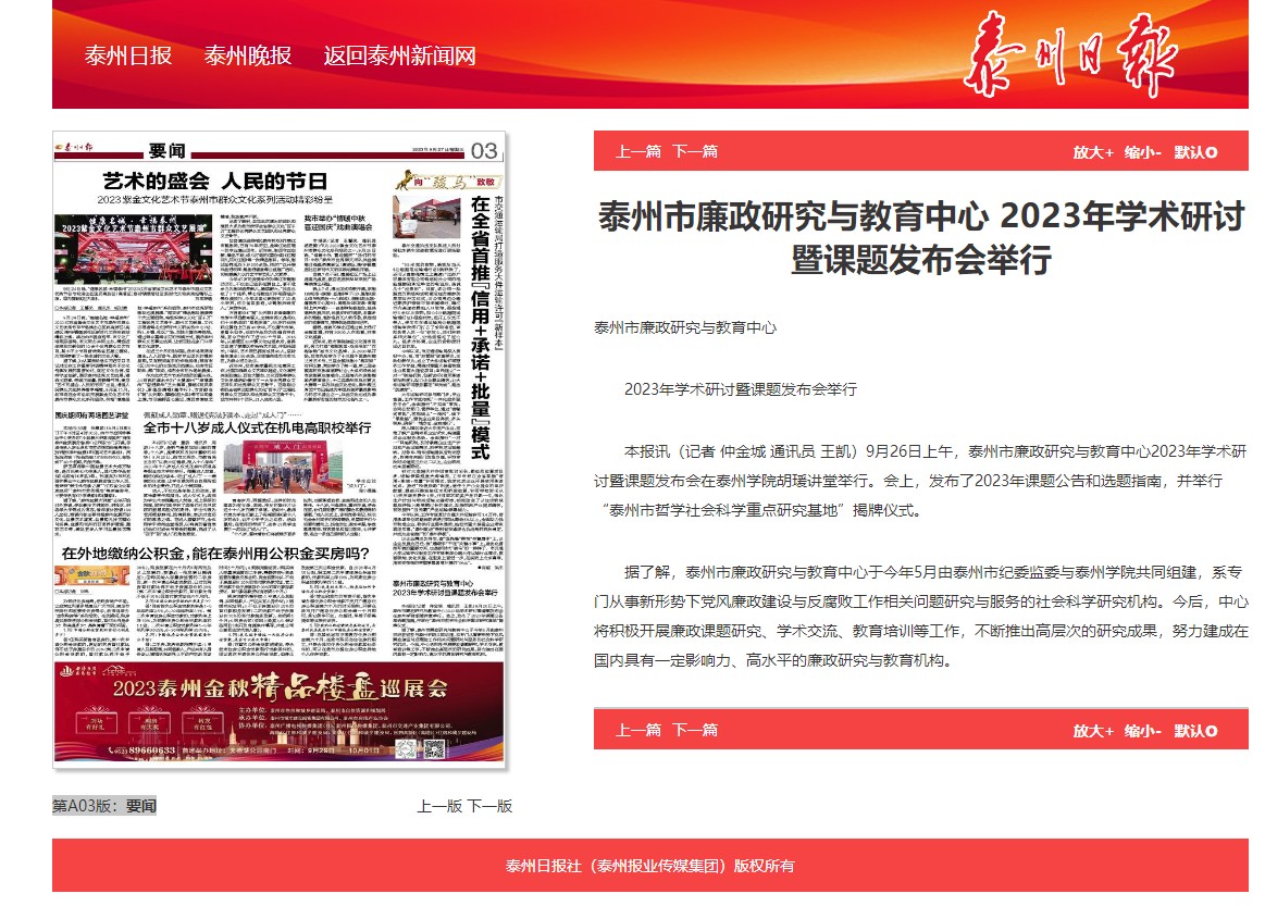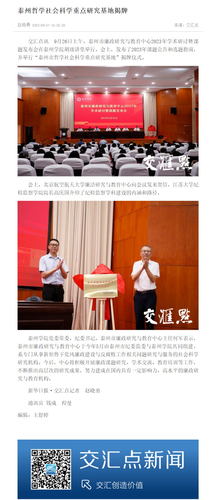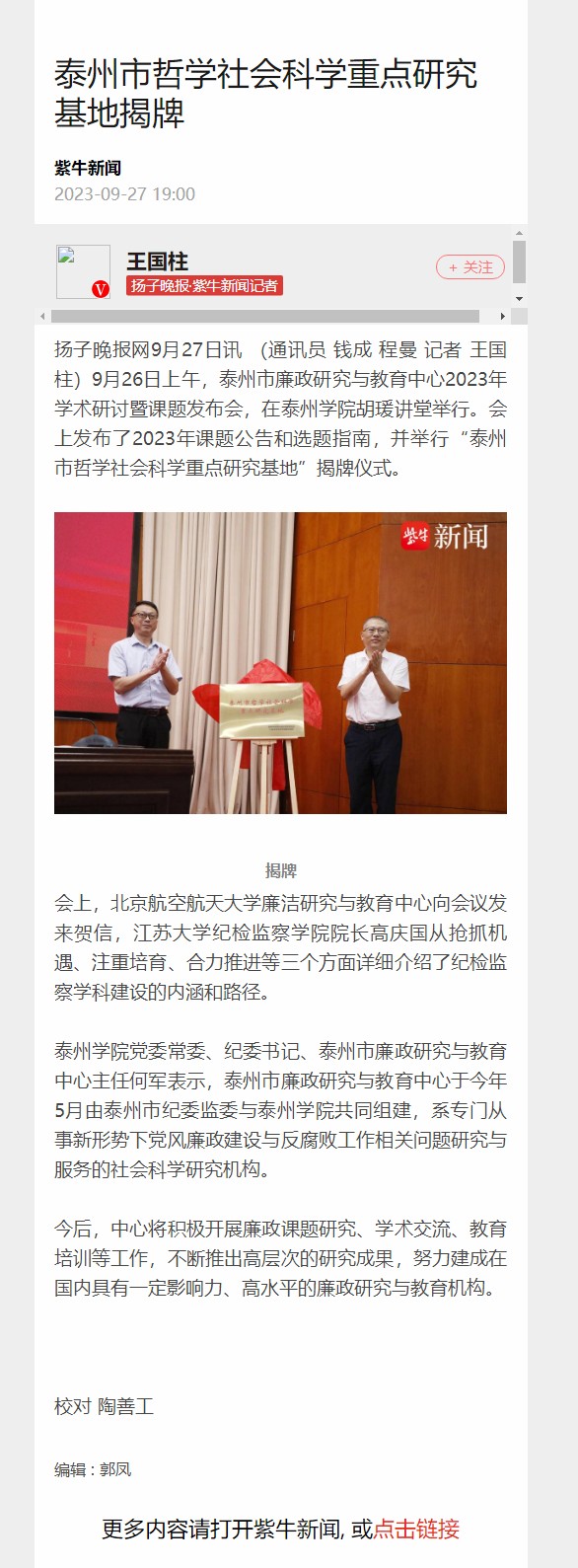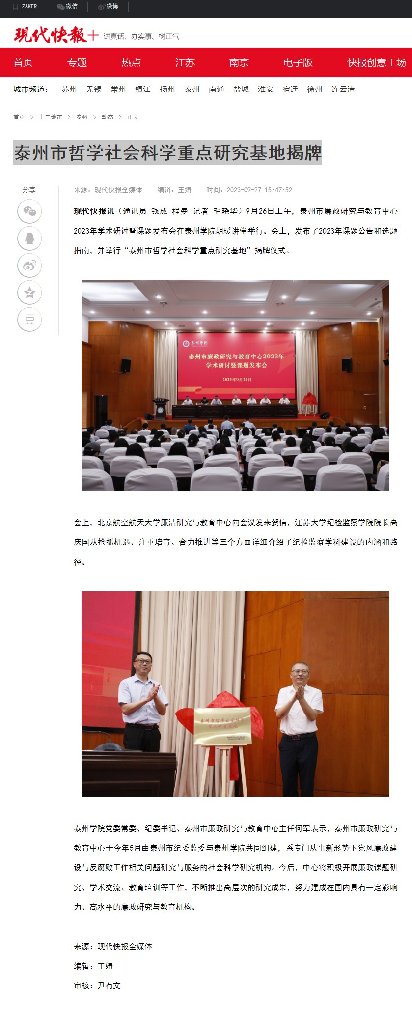 9月27日,《泰州日报》《现代快报》《交汇点新闻》《紫牛新闻》等媒体报道在Ky开元举行的泰州市廉政研究与教育中心2023年学术研讨暨课题发布会。报道链接如下: