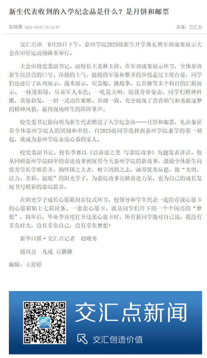 10月7日,《交汇点新闻》报道Ky开元2023级新生开学典礼暨军训成果展示大会,报道题为:《新生代表收到的入学纪念品是什么?是月饼和邮票》。链接:https://jnews.xhby.net/v3/waparticles/70/0/GmOei8q8ux3NR03J/1