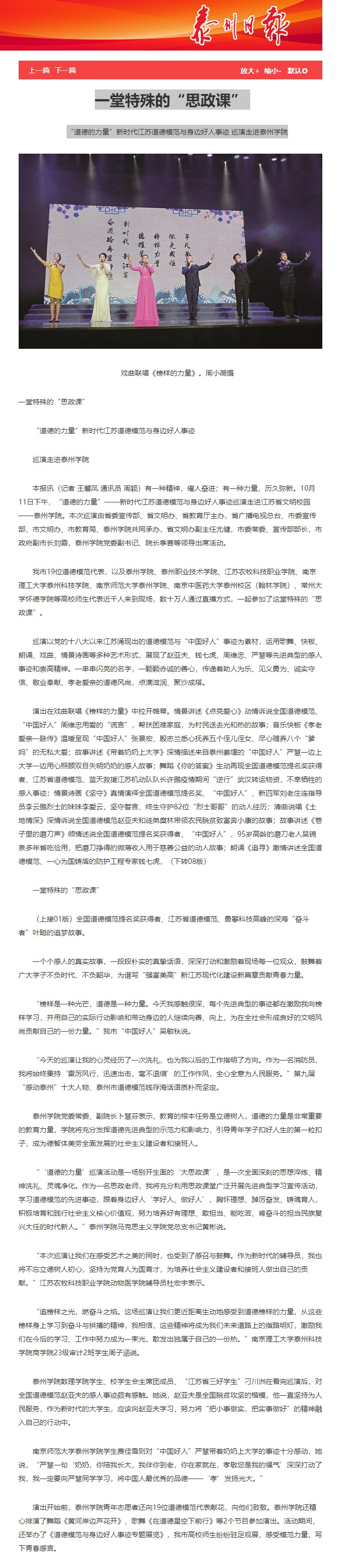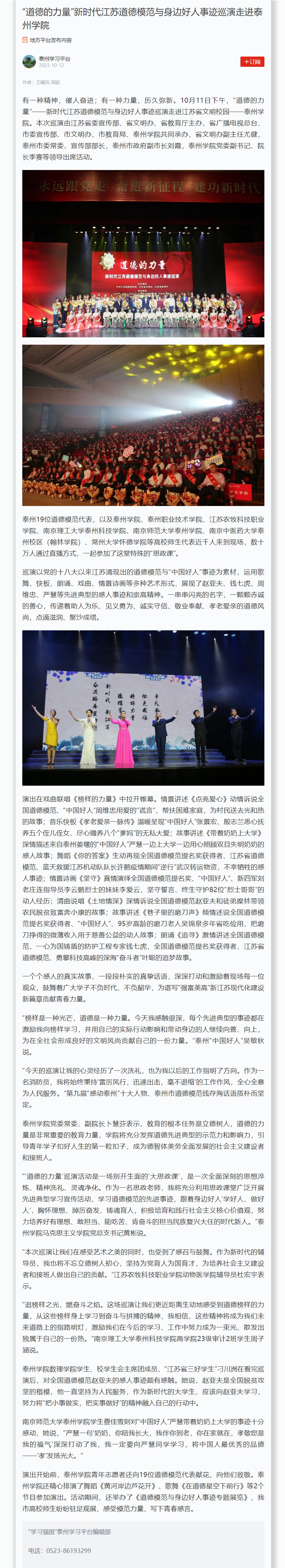 2023年10月11日《江苏时代楷模发布厅》《泰州发布》《文明泰州》微信公众号,10月12日《学习强国》《泰州日报》《江苏文明网》报道“道德的力量”新时代江苏道德模范与身边好人事迹巡演走进Ky开元。报道链接: