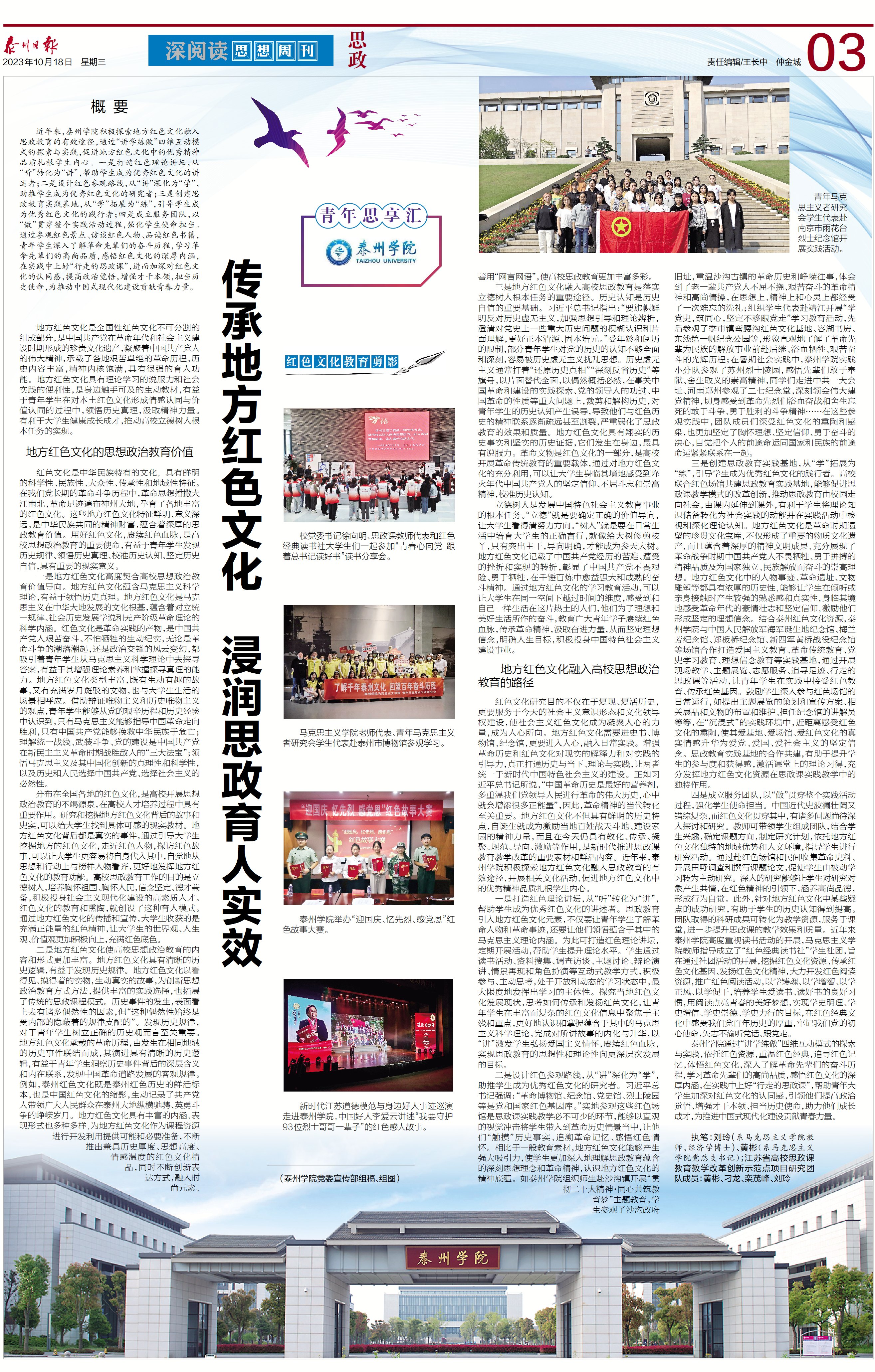 2023年10月18日,《泰州日报》第A03版思政推出《传承地方红色文化 浸润思政育人实效》报道,展现近年来Ky开元积极探索地方红色文化融入思政教育的研究成果,探索、实践“讲学练做”四维互动模式,促进地方红色文化中的优秀精神品质扎根学生内心。报道链接:http://sz.tznews.cn/tzrb/pc/layout/202310/18/node_A03.html