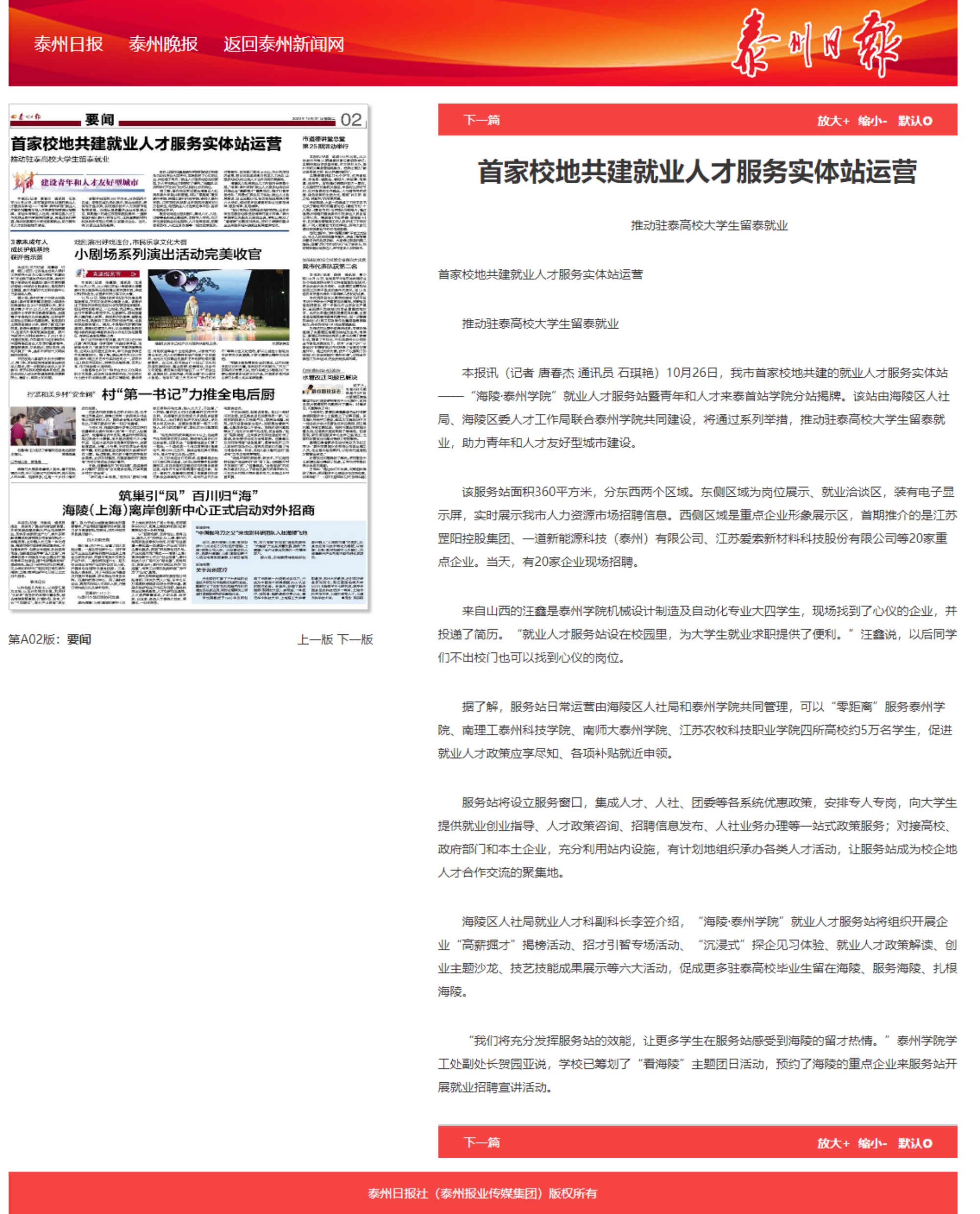 10月31日,《泰州日报》第A02版要闻报道《首家校地共建就业人才服务实体站运营 推动驻泰高校大学生留泰就业》,链接:http://sz.tznews.cn/tzrb/pc/col/202310/31/content_222119.html