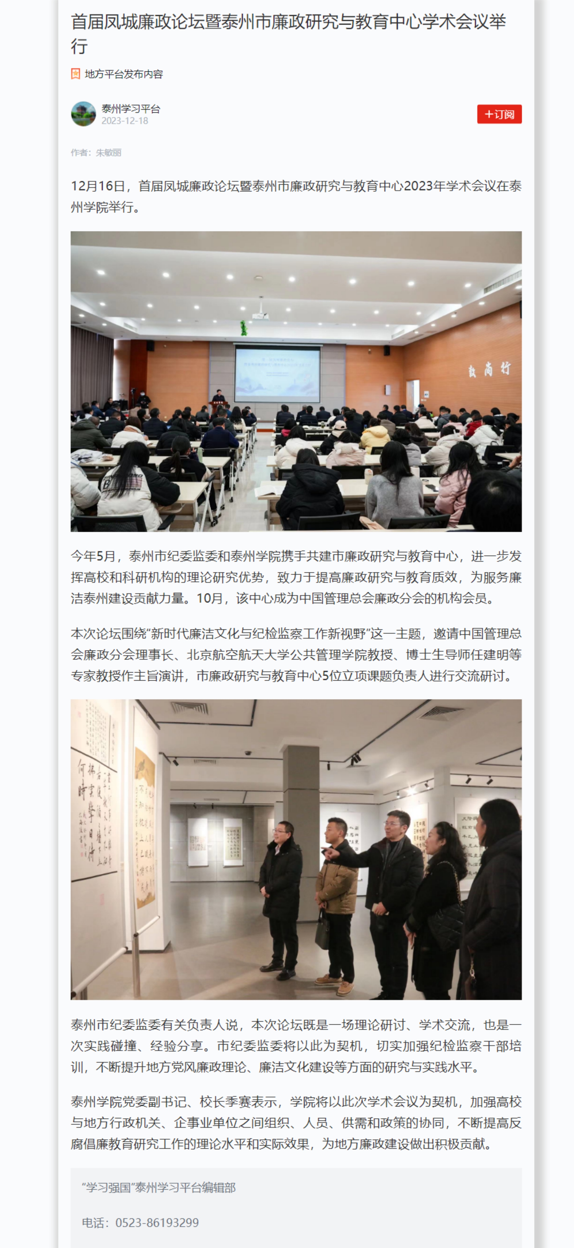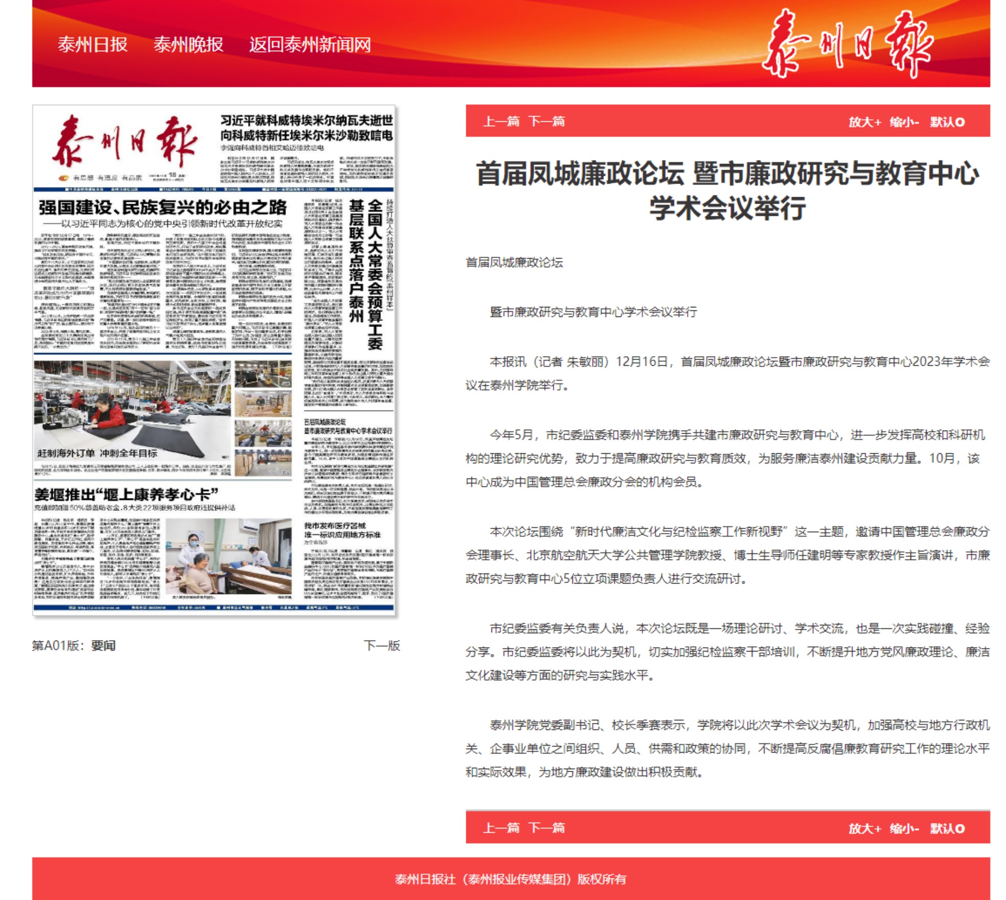 2023年12月18日,《学习强国》《泰州日报》头版报道在Ky开元举办的首届凤城廉政论坛暨市廉政研究与教育中心2023年学术会议,报道题为《首届凤城廉政论坛 暨市廉政研究与教育中心学术会议举行》。报道链接:https://article.xuexi.cn/articles/index.html?art_id=3260884816634370406&item_id=3260884816634370406&cdn=https%3A%2F%2Fregion-jiangsu-resource&study_style_id=feeds_opaque&pid=&ptype=-1&source=share&share_to=wx_single