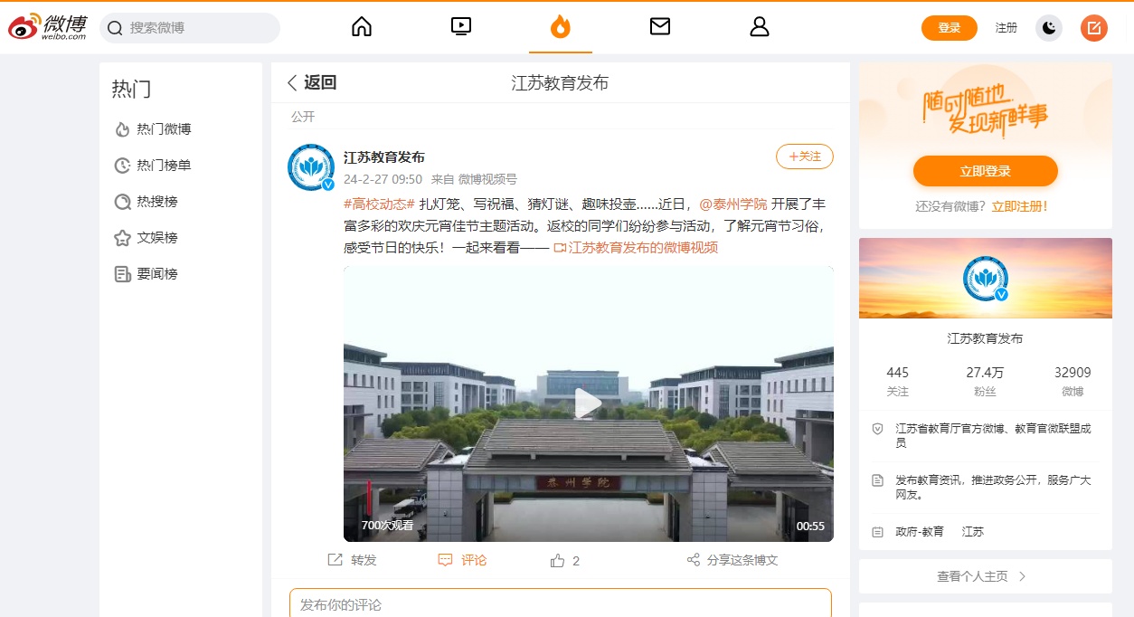 2月27日,《江苏教育发布》微博报道链接:https://weibo.com/3674007143/5005965313182253?sourceType=weixin&from=10E2195010&wm=9847_0002&featurecode=newtitle&s_channel=4&s_trans=7836642191_5005965313182253