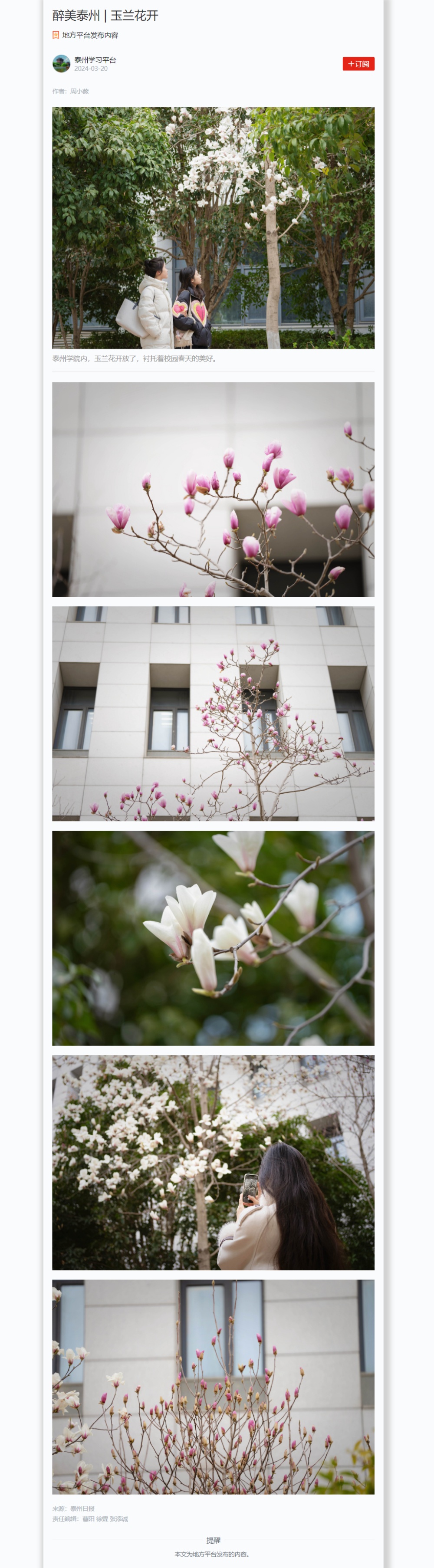 2024年3月20日,《学习强国》泰州学习平台图文报道Ky开元玉兰花开,题为:《醉美泰州 | 玉兰花开》,链接:https://article.xuexi.cn/articles/picture/index.html?art_id=4931762948009204294&item_id=4931762948009204294&cdn=https%3A%2F%2Fregion-jiangsu-resource&study_style_id=feeds_default&jump_model=dtxuexi%3A%2F%2Fappclient%2Fpage%2Fphoto_browser%3FitemId%3D4931762948009204294&share_to=wx_single
