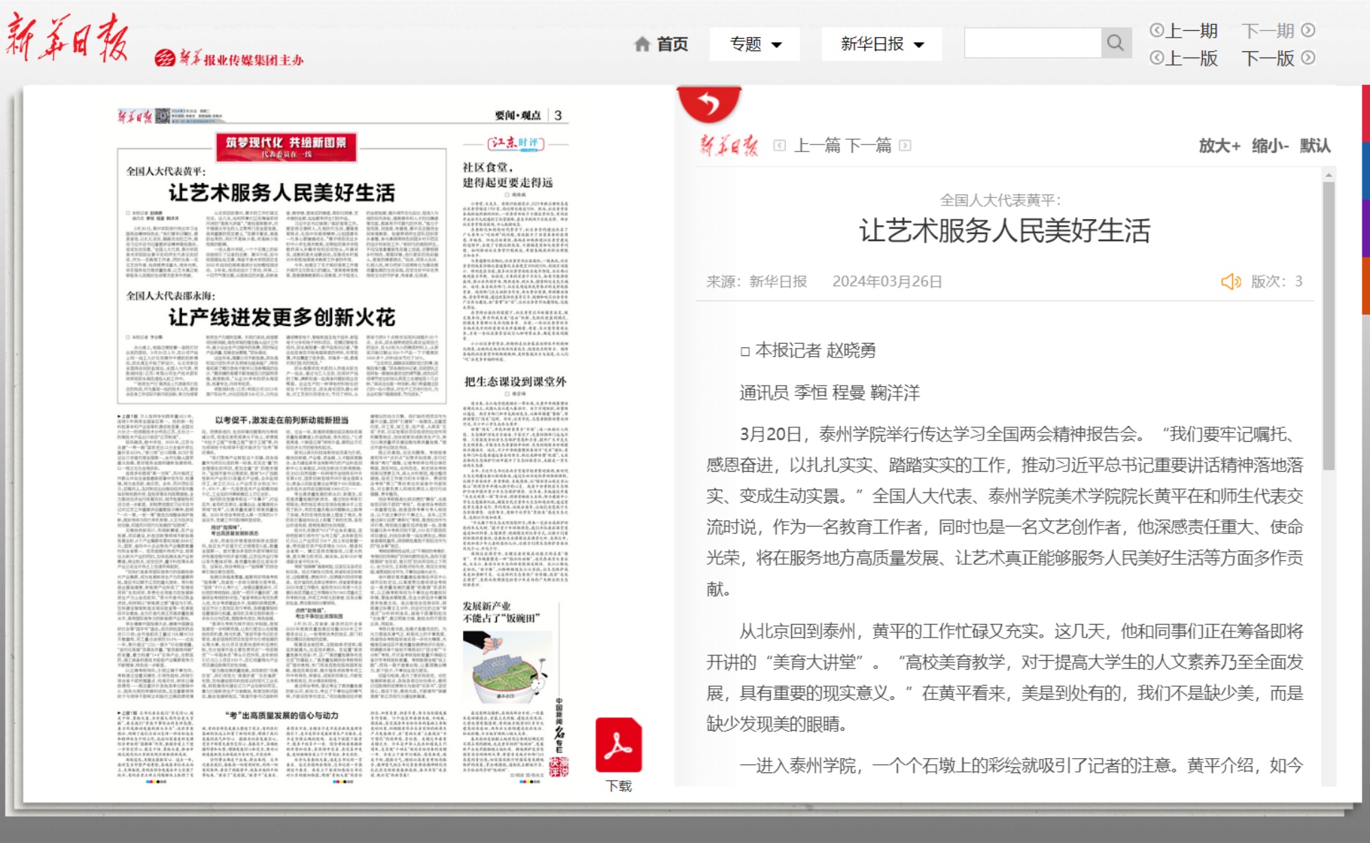 2024年3月26日,《新华日报》3版要闻·观点报道《全国人大代表黄平:让艺术服务人民美好生活》,报道链接:https://xh.xhby.net/pc/layout/202403/26/node_3.html#content_1310002