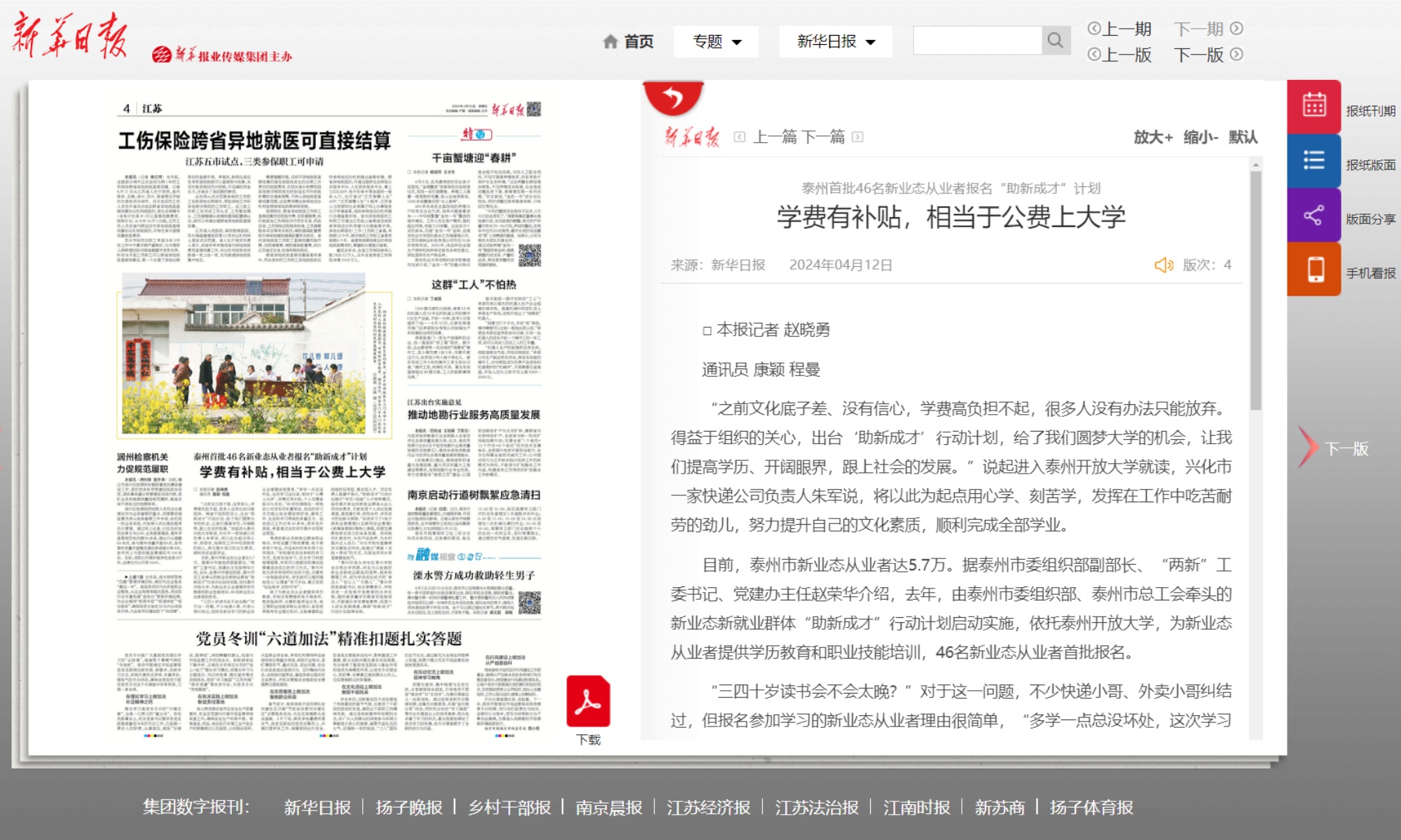 2024年4月12日,《新华日报》第4版江苏报道泰州开放大学相关工作,报道链接:https://xh.xhby.net/pc/layout/202404/12/node_4.html#content_1315942