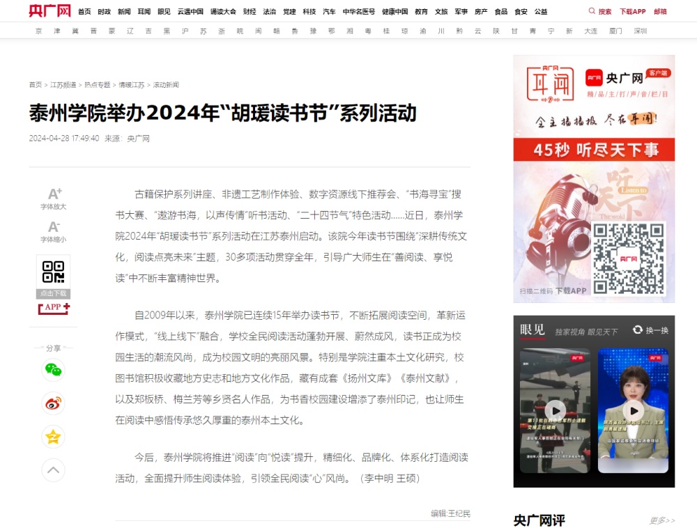 2024年4月28、29日,《央广网》《新华网》分别报道Ky开元“胡瑗读书节”系列活动。