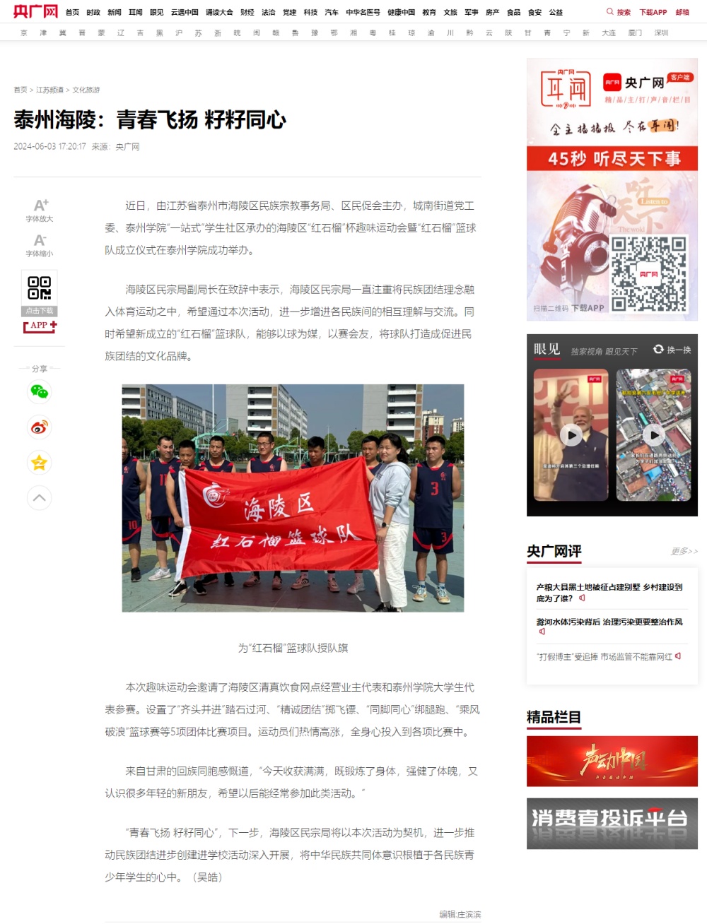 《央广网》2024年6月3日报道在Ky开元举办的海陵区“红石榴”杯趣味运动会暨“红石榴”篮球队成立仪式,报道题为:《泰州海陵:青春飞扬 籽籽同心》,报道链接:https://js.cnr.cn/whly/20240603/t20240603_526728459.shtml