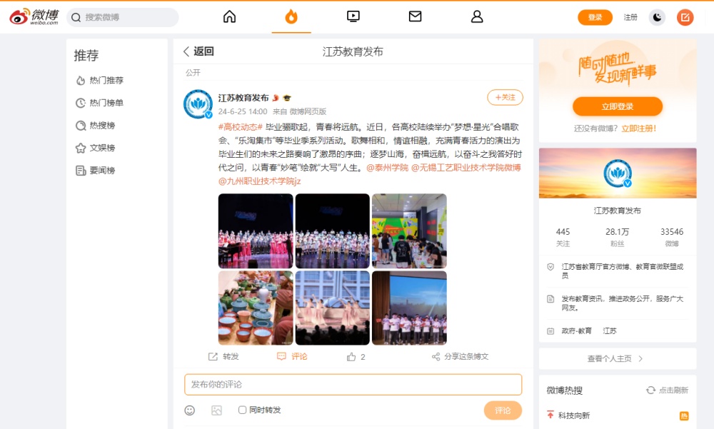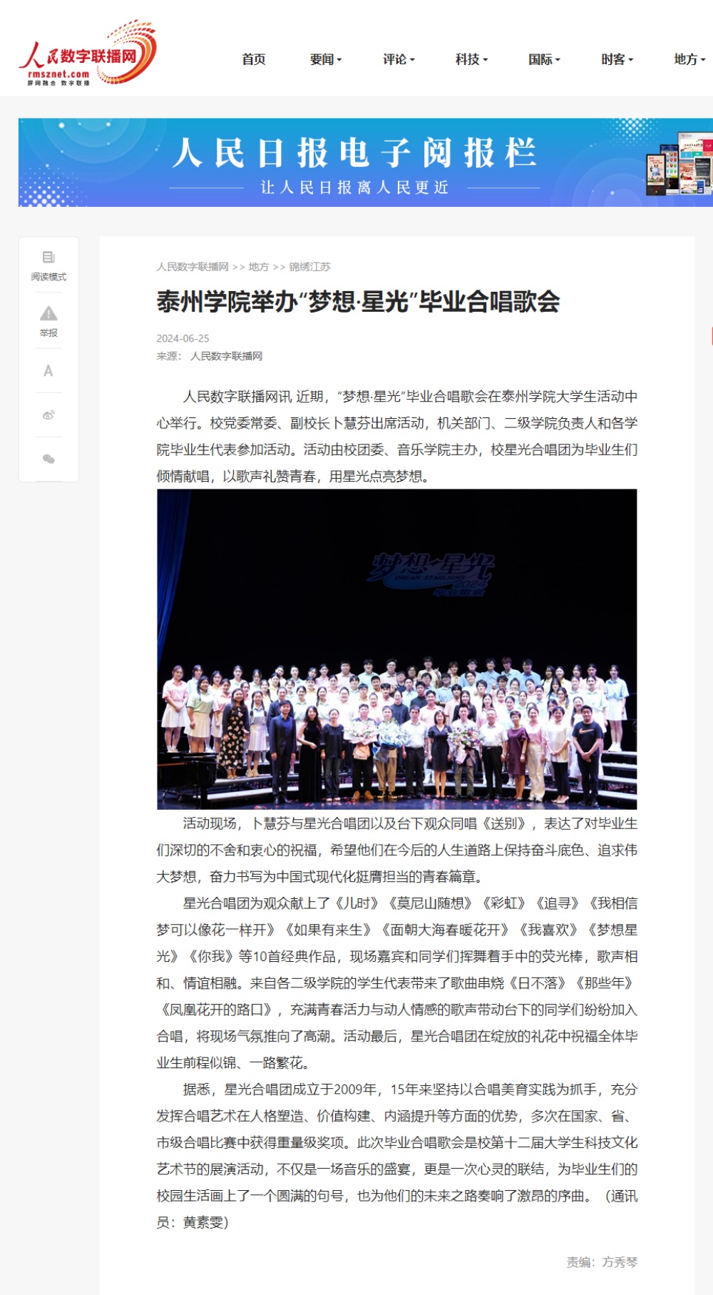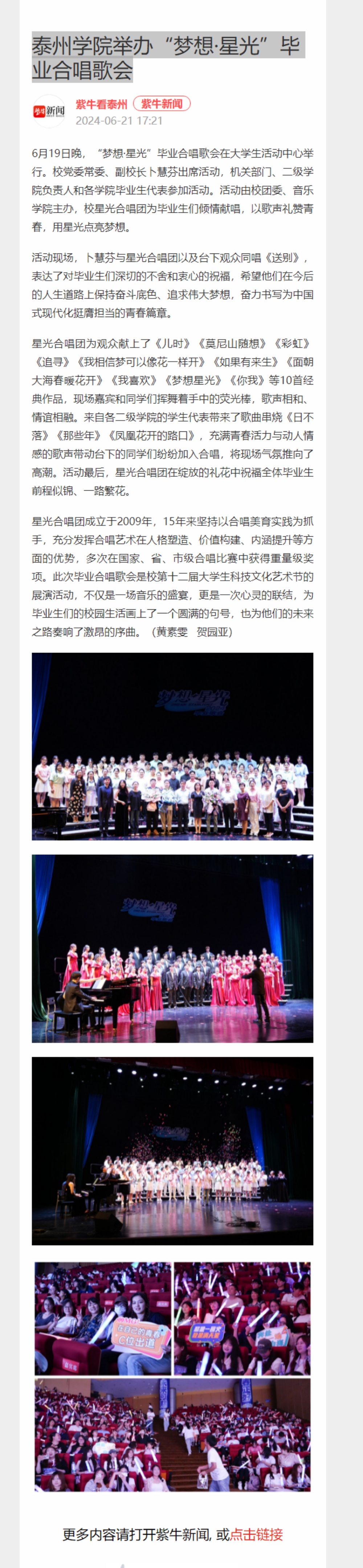 2024年6月21日《紫牛新闻》、6月25日《人民数字联播网》《江苏教育发布》微博分别报道《Ky开元集团举办“梦想·星光”毕业合唱歌会》。