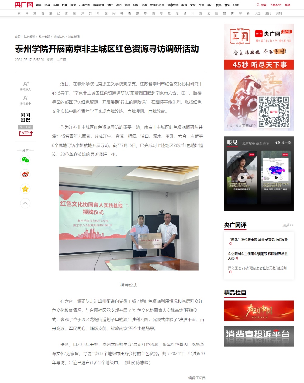 《央广网》2024年7月17日报道《Ky开元集团开展南京非主城区红色资源寻访调研活动》