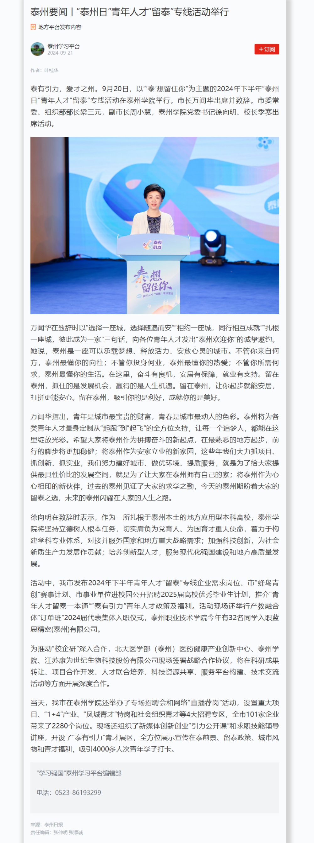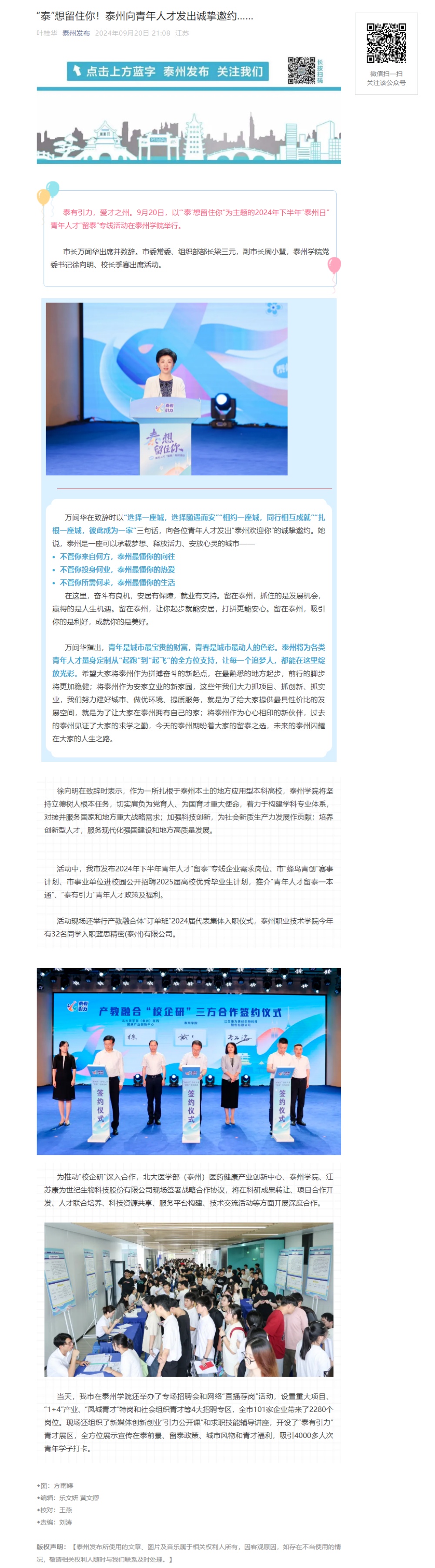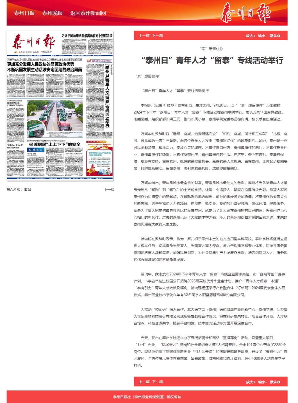 《泰州发布》《泰州广播电视台》《泰州日报》《学习强国》等多个平台2024年9月20日、21日分别报道在Ky开元举行的“泰州日”青年人才“留泰”专线活动