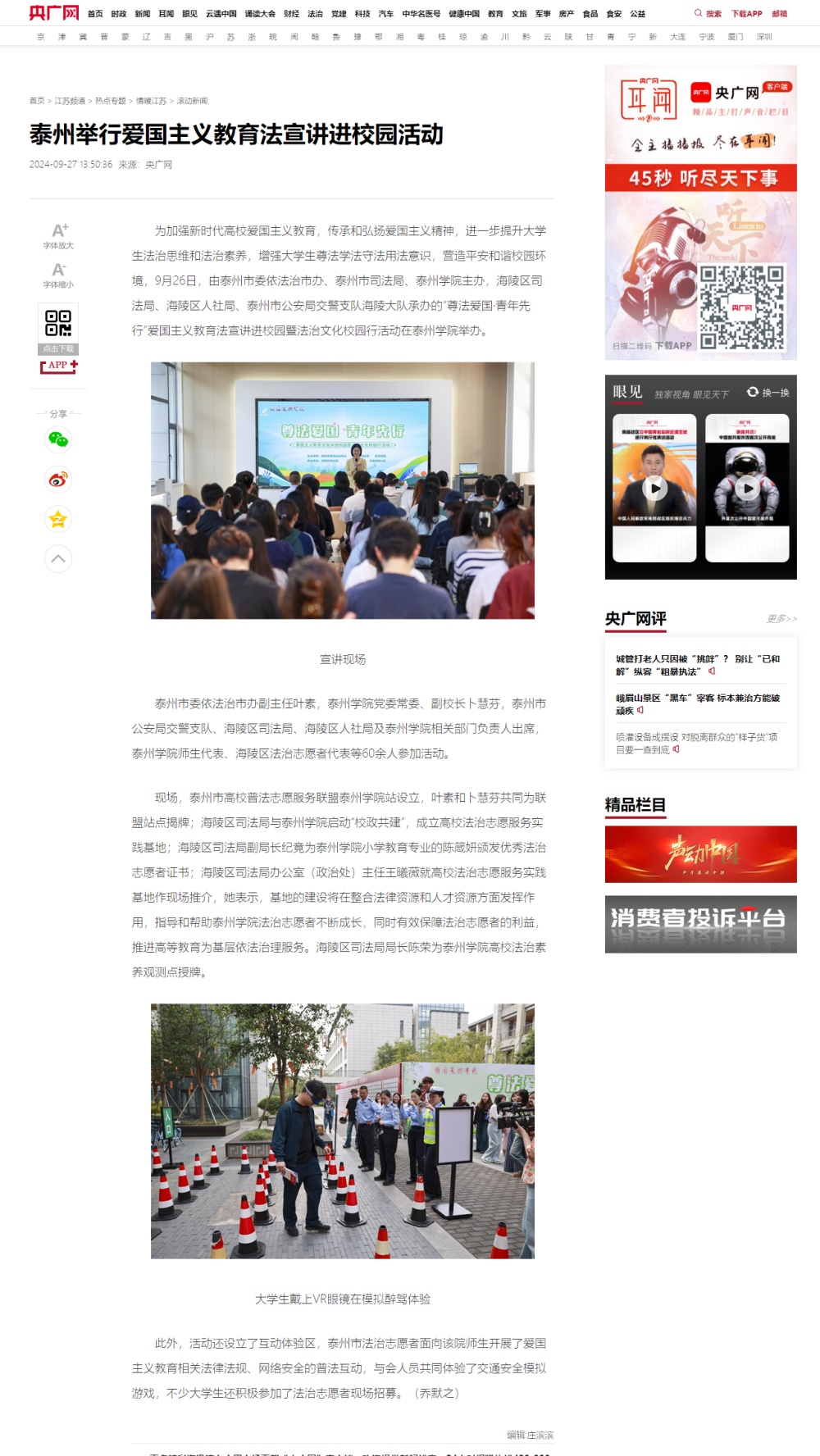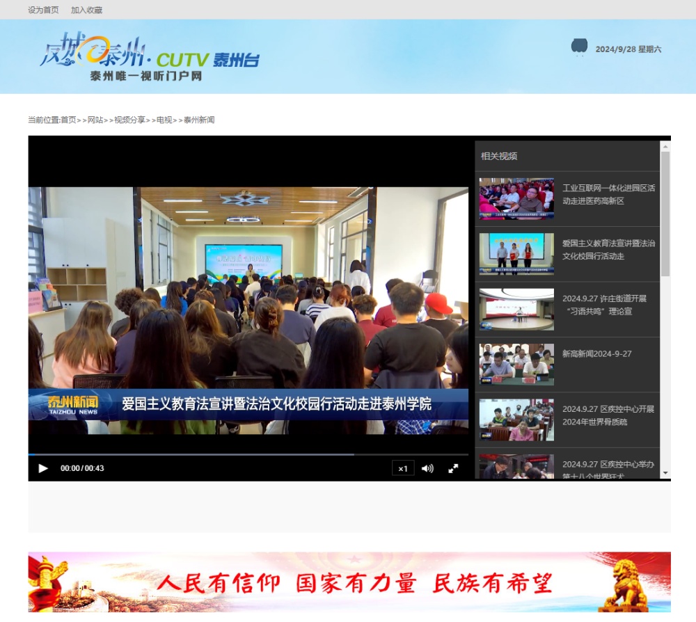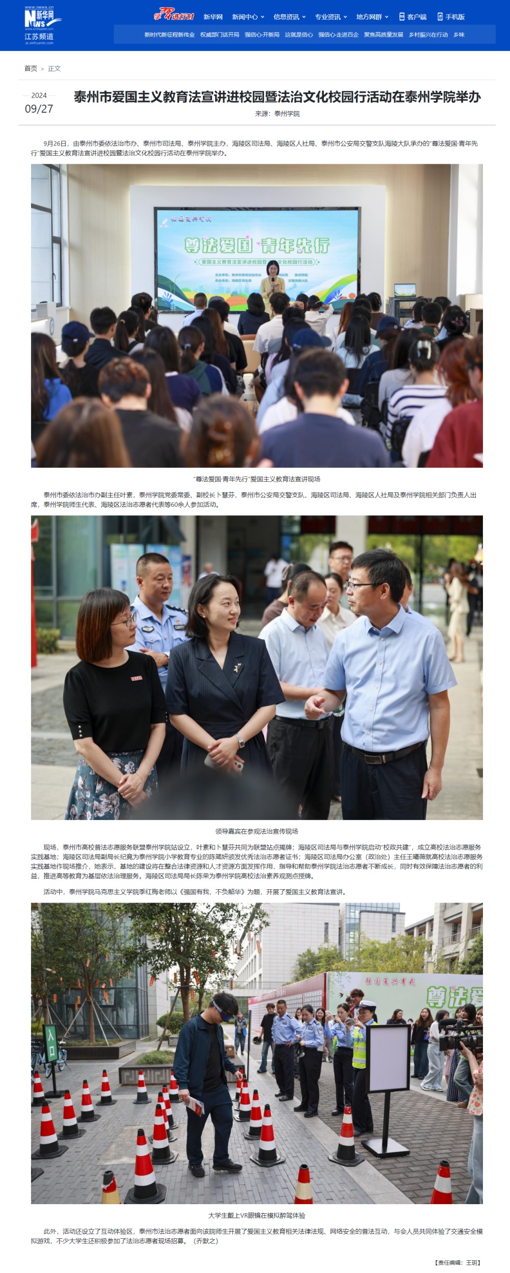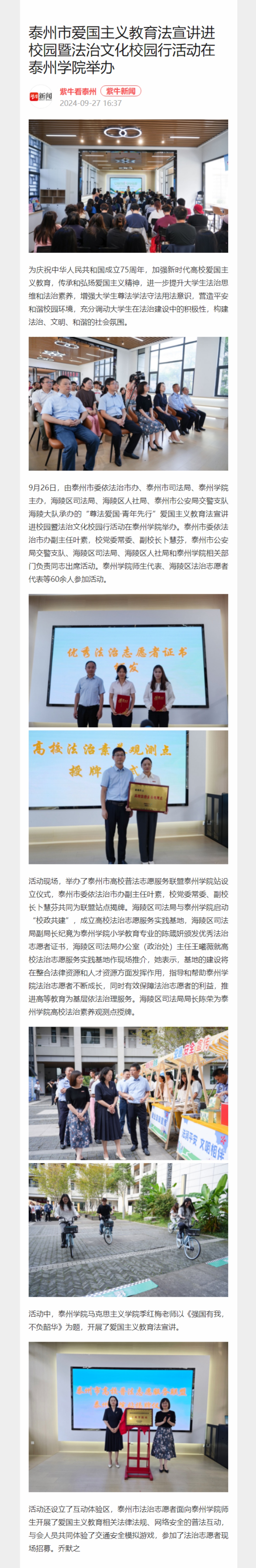 《新华网》《央广网》《紫牛新闻》《泰州广播电视台》2024年9月27日报道泰州市爱国主义教育法宣讲暨法治文化校园行活动走进Ky开元